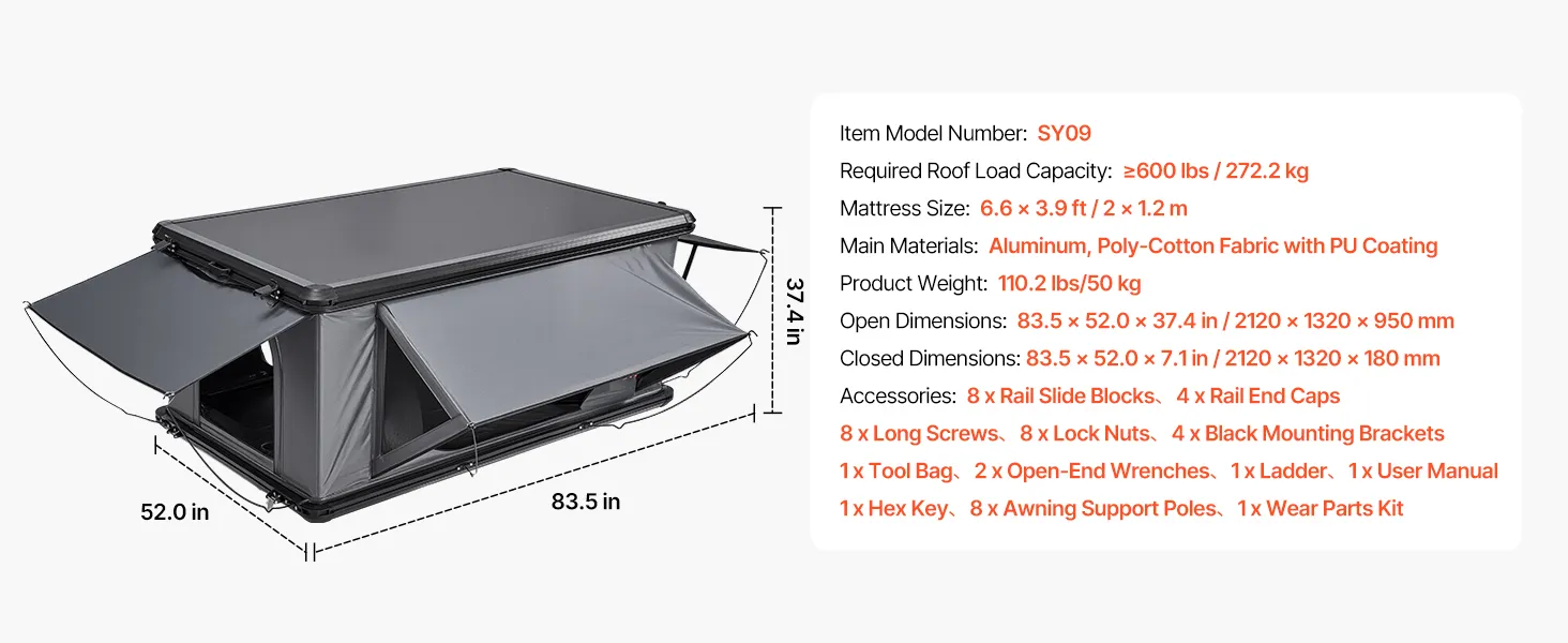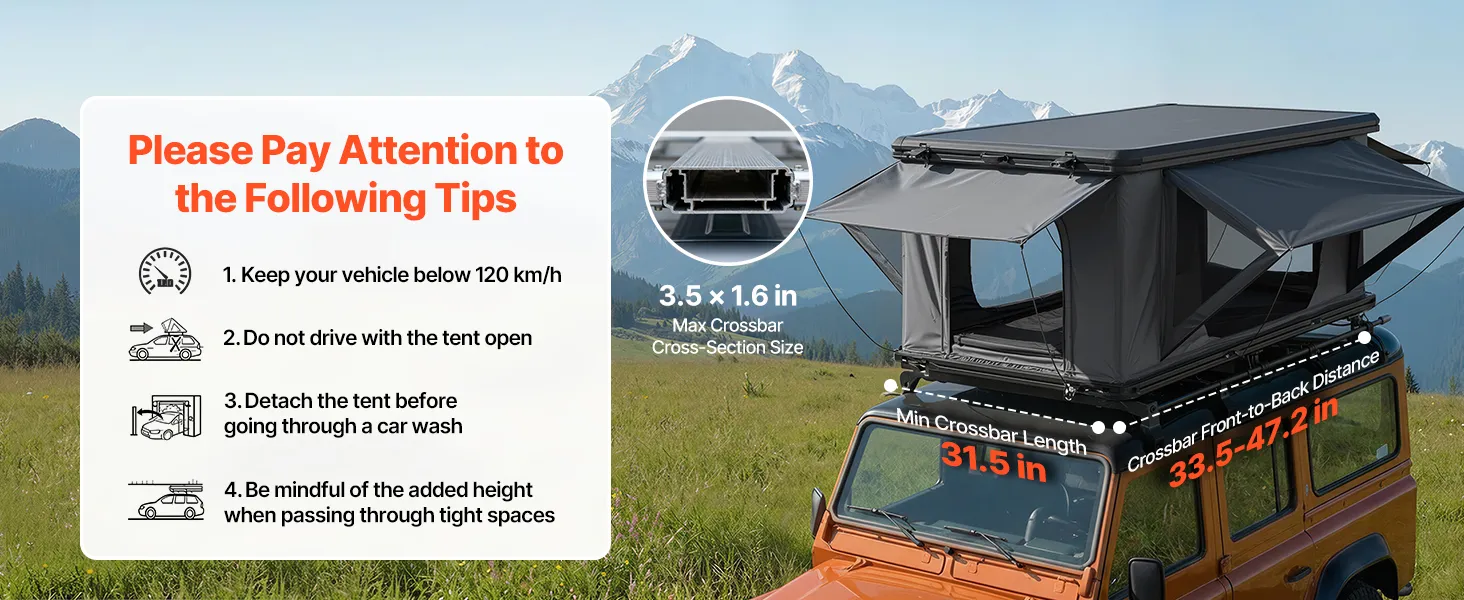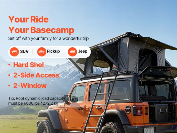 Convenient Setup: Enjoy a quick and secure way to set up your hard shell rooftop tent. Designed for SUVs, Jeeps, and trucks, it requires a roof rack with a dynamic load capacity of at least 600 lbs. All mounting hardware and tools are included