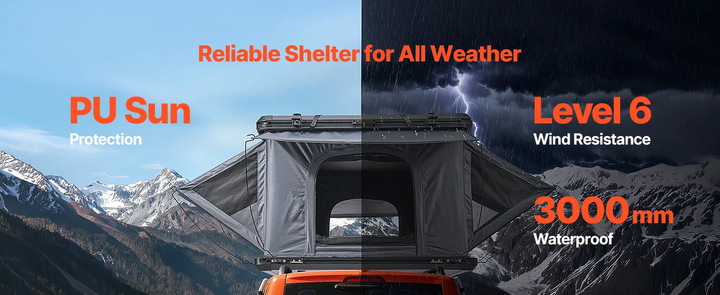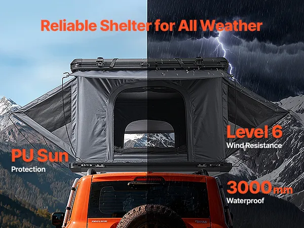 Durable Weather Protection: This camping roof top tent uses high-density poly-cotton fabric with a PU coating for dependable protection. With a 3000MM waterproof rating, it resists rain, snow, and abrasion. Durable materials ensure long-term performance