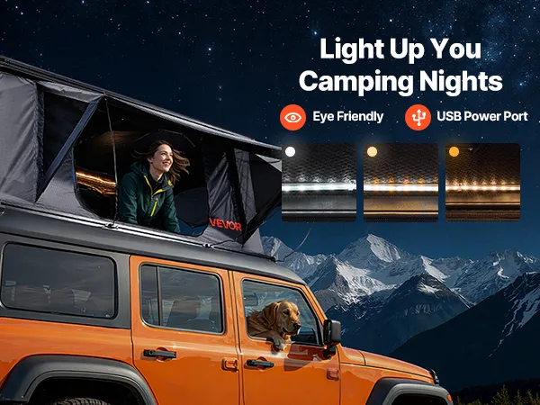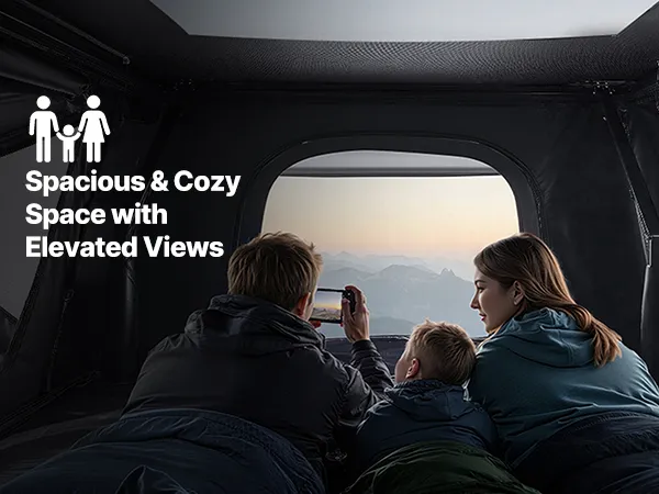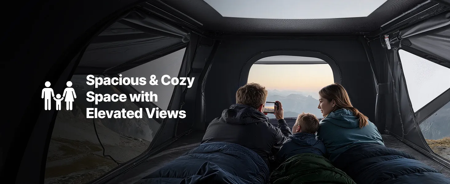 Spacious & Comfortable Interior: The car roof tent is designed to accommodate 2-3 people. Two doors and two windows promote airflow while allowing you to enjoy the view. A thick foam mattress and built-in LED lighting enhance comfort for overnight stays