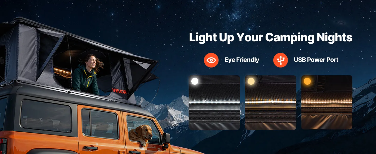 VEVOR Rooftop Tent Hard Shell, 2-3 Person Aluminum Roof Top Tent Hardshell with Tri-Color LED Light, Thick Mattress & 2 Windows, Waterproof Windproof Overland Camping Car Roof Rack for Jeep SUV Pickup