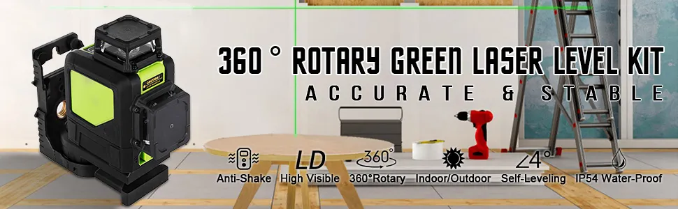 【360° ROATRY LASER LEVEL】- Advanced 360° rotary laser module, emit clear green beams. Wave length: 510nm. 8 line design, scan the construction area horizontally & vertically. The green beam accuracy: ±0.3mm/m. Make your work more precise.