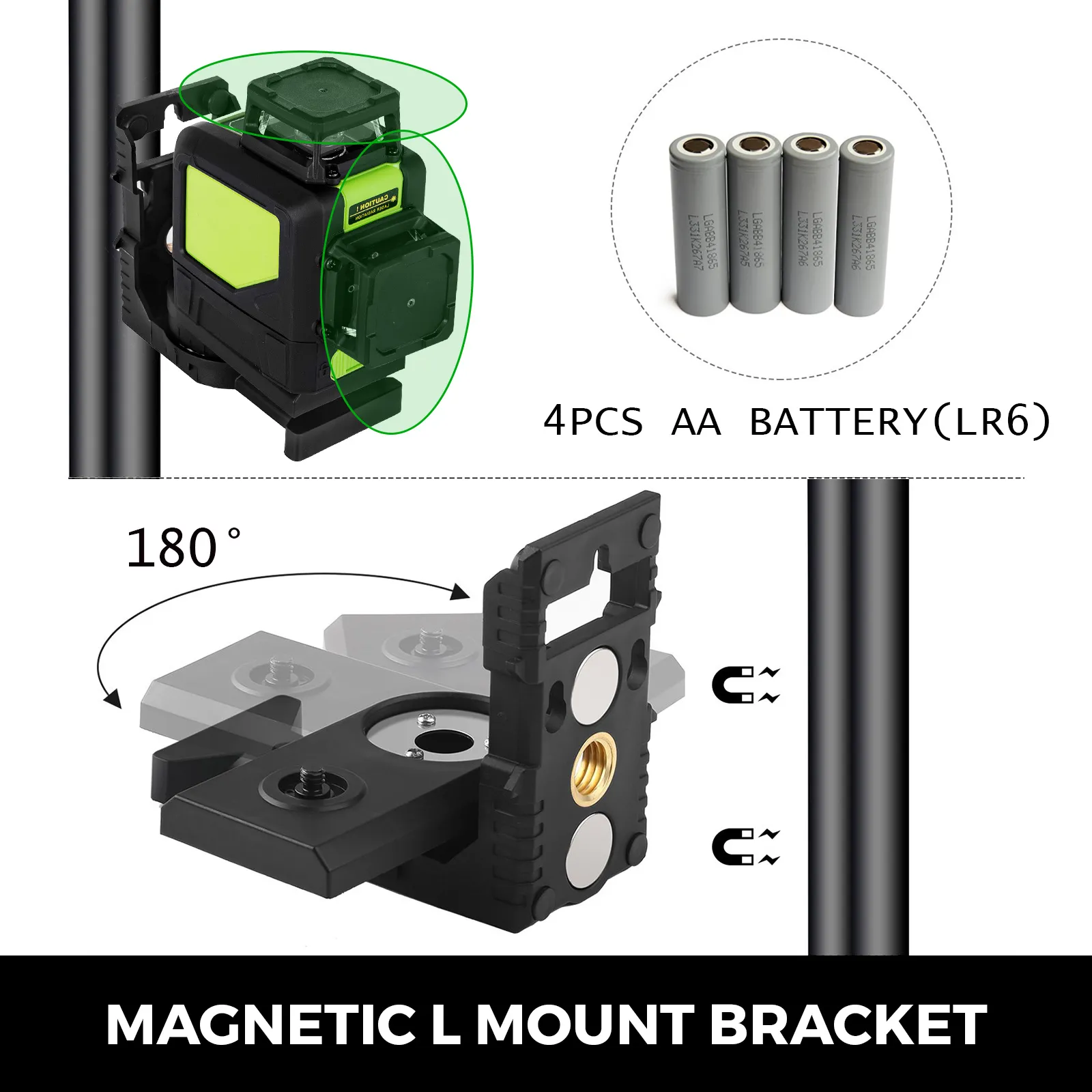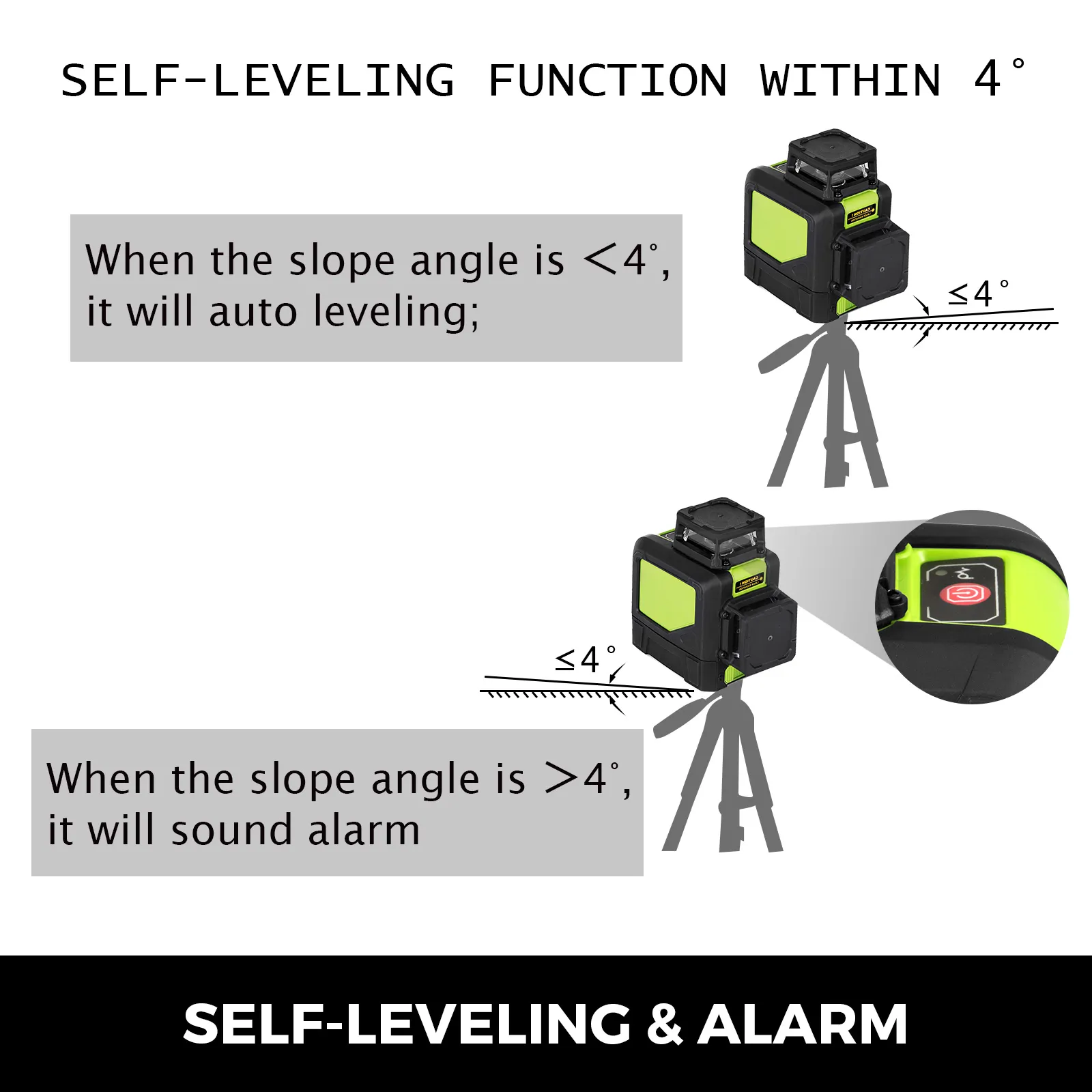 【LEVELING & L-SHAPE MOUNT】- Automatic self-leveling range: 4°, alarms when over the slope range. Also send a strong magnetic L-shaped mount to attach the laser level to any steel easily. It accepts a standard tripod screw to do height adjustment.