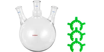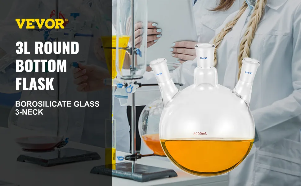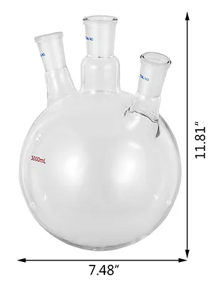 The round bottom flask is made of heat-resistant borosilicate glass with a massive wall, making it sturdy and durable. The flasks around the neck are equipped with three 24/40 standard taper joints with the frosted inner surface, which have excellent sealing without any leakage. With stable performance, this cork stand round bottom flask is widely applied in organic chemistry.