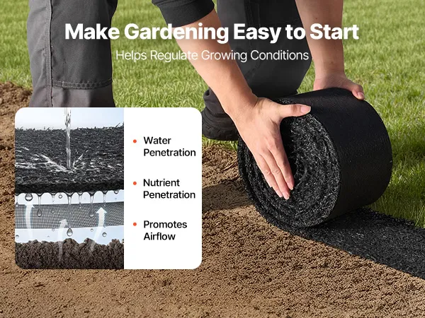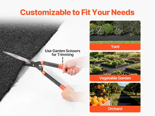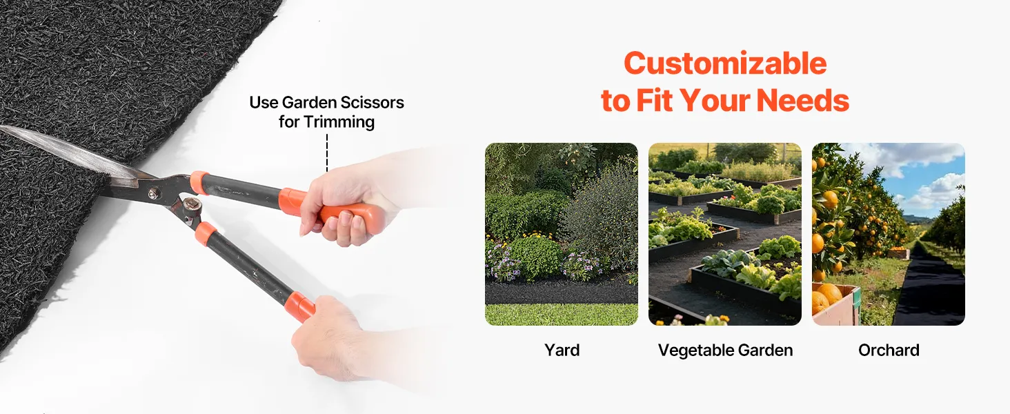 Easy to Cut & Install: This garden mulch mat can be trimmed with gardening scissors to fit any shape or space. Simply lay it flat on the ground. It is ideal for yards, vegetable gardens, orchards, and landscaping areas, saving your time and effort