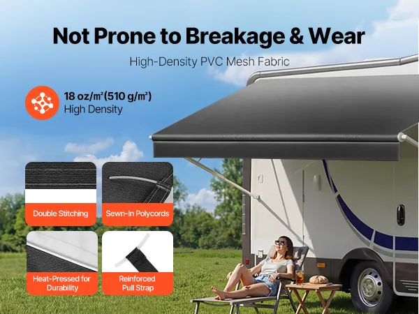 18 oz Heavy-Duty Fabric: Crafted from 4-layer high-density 18 oz/㎡ (510 g/㎡) PVC mesh, this replacement RV awning fabric withstands strong winds, tears, and wear. Double stitching and heat-sealed seams deliver lasting performance for outdoor use