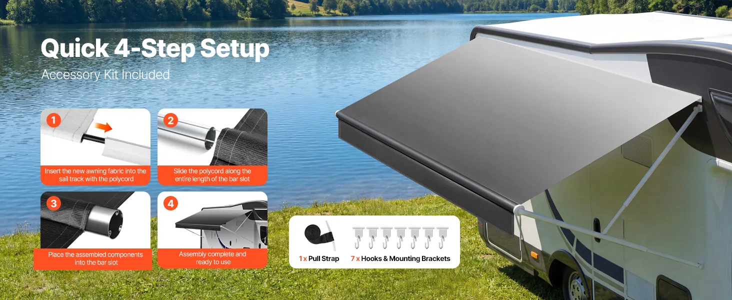 Quick Installation: The camper awning replacement fabric includes three sewn-in PE ropes for secure attachment. The detailed user manual guides you securely through replacement, even for complex torsion spring systems