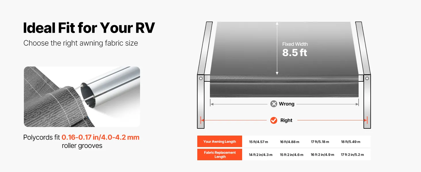 • Size Options: Available in 15 ft (4.57 m), 16 ft (4.88 m), 17 ft (5.18 m), and 18 ft (5.49 m), our awning fabric fits most manual and electric RV awnings. Measure the distance between the center of the right and left awning arms before purchase