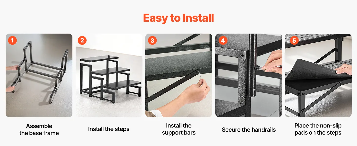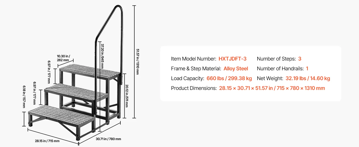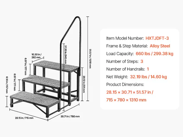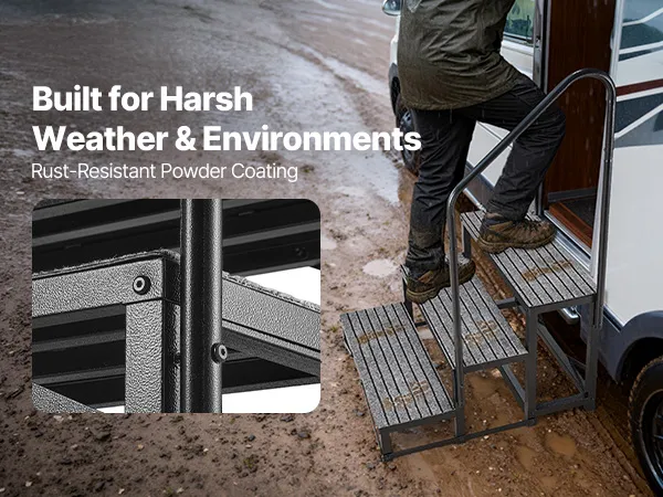 Sturdy & Stable with High Load Capacity: This 3-step RV stair is made of heavy-duty alloy steel with reinforced crossbars on the bottom and a triangular support structure, supports up to 660 lbs / 299.38 kg