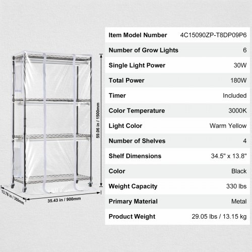 VEVOR Indoor Greenhouse with Grow Light, 4 Tiers, 180W LED Grow Light Shelf with Waterproof Cover & Timer, 3 Spectrum Light Portable Greenhouse Cabinet Plant Stand for Seed Starting 90 x 35 x150 cm