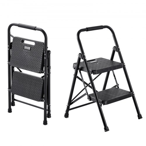VEVOR 2 Step Ladder, Folding Step Stool with Wide Anti-Slip Pedal and Comfort Handgrip, Lightweight 272 kg Capacity Portable Steel Ladder, Multi-Use for Kitchen, Home, Household and Office, Black