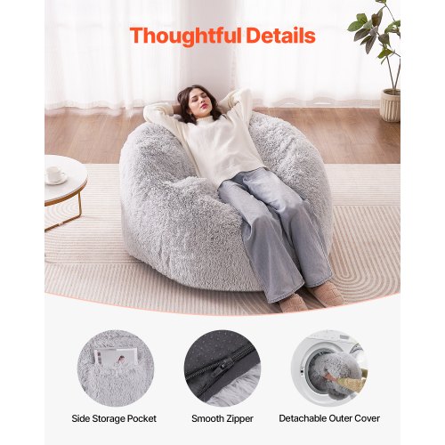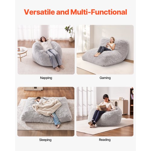 VEVOR Bean Bag Bed Chair, Convertible Chair from BeanBag to Lounge or Mattress, Gaint Bean Bag Chair Bed with Washable Cover for Adults, Fluffy Plush, Foam Filling and Side Pocket, Grey(Full Size)