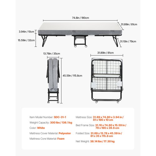 VEVOR Rollaway Bed, 79 cm x 190 cm Folding Bed with 12.5 cm Mattress, Twin Size Foldable Bed with Sturdy Metal Frame & Memory Foam Mattress, Portable Roll Away Bed with Mattress, for Adults, Guest