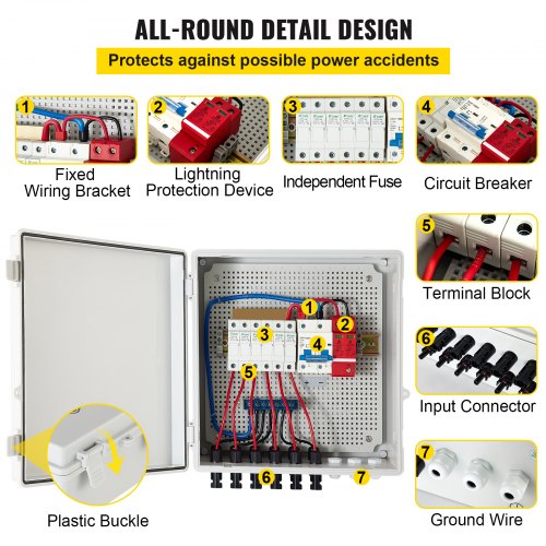 VEVOR PV Combiner Box, 6 String, Solar Combiner Box with 15A Rated Current Fuse 125A Circuit Breaker Lightning Arrester and Solar Connector, Steel Case for On / Off Grid Solar Panel System, IP65
