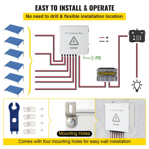VEVOR PV Combiner Box, 4 String with 15A Rated Current Fuse, 63A Circuit Breaker, Lightning Arreste Connector for On/Off Grid Solar Panel System, IP65