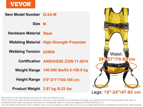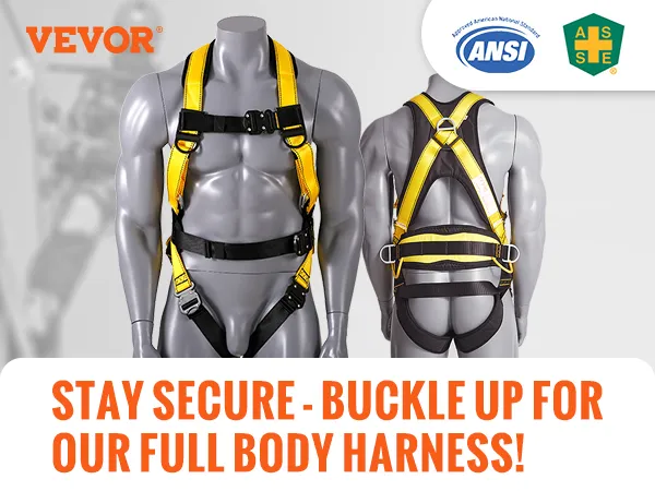 Safety is a top priority with the VEVOR full body harness. It meets the ANSI/ASSE Z359.11-2014 harness certification standards. This indicates that it has undergone rigorous testing. We designed the harness to ensure the highest level of safety. The harness is equipped with dorsal D-rings and side rings, enhancing its safety capabilities. The certification assures users of the harness's reliability.