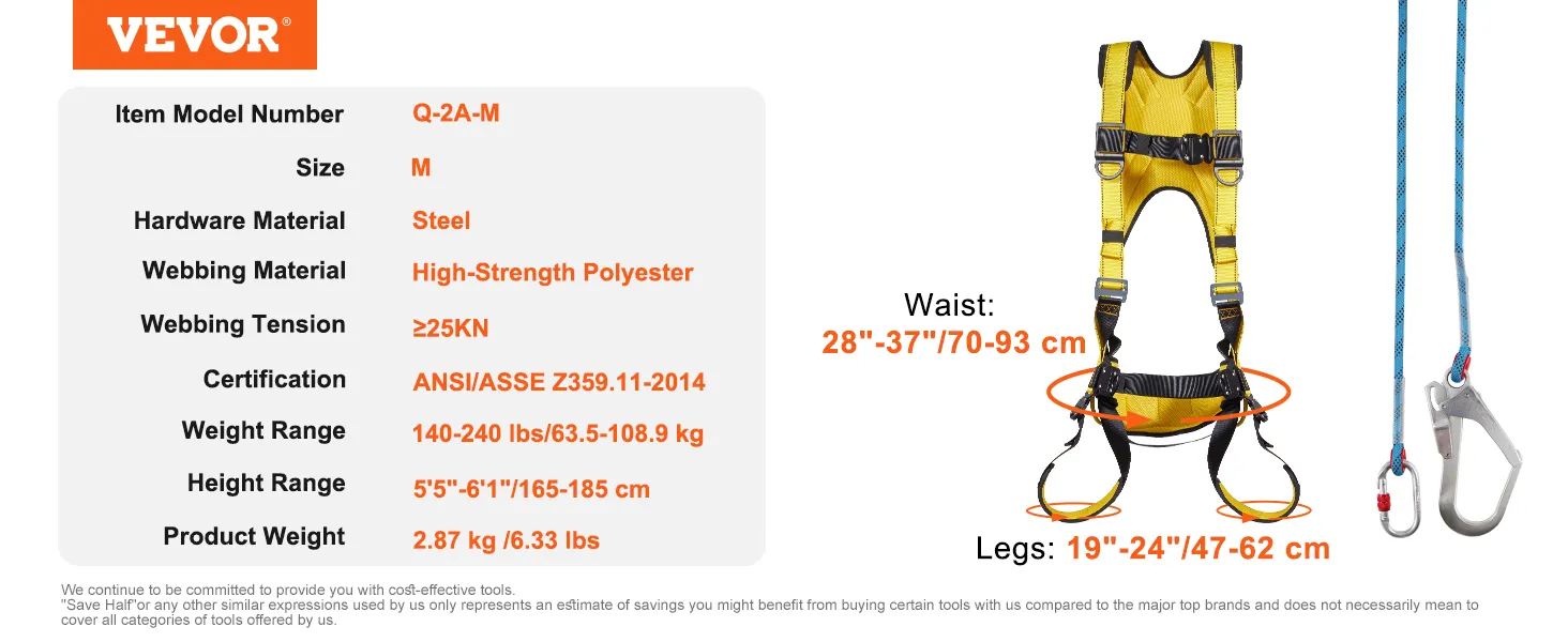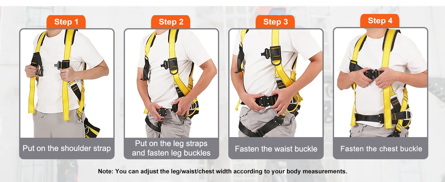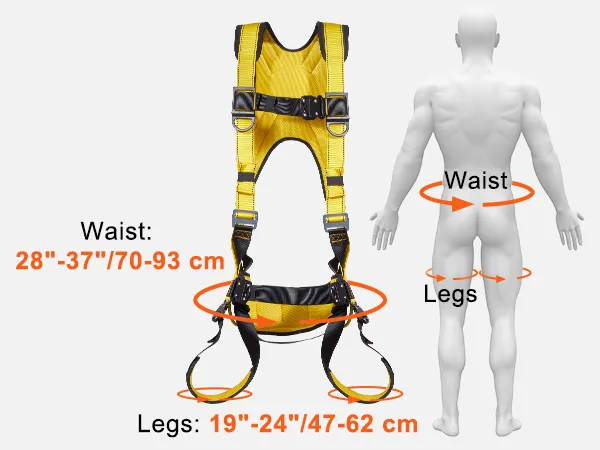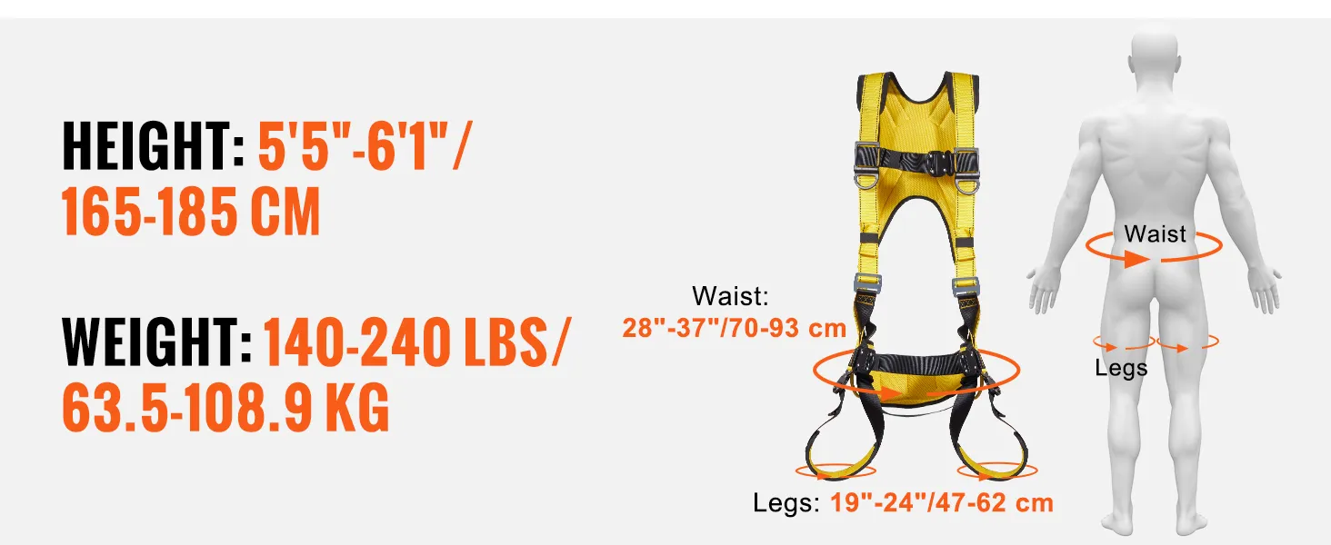 Accommodate Wide Range of Sizes: Here is the M-size of safety harness fall protection. Height range:5'5"-6'1"(165-185 cm), weight range: 140-240 lbs(63.5-108.9 kg), waist: 28"-37"(70-93 cm), leg: 19"-24"(47-62 cm). These areas can be adjusted by the buckle for a perfect fit.