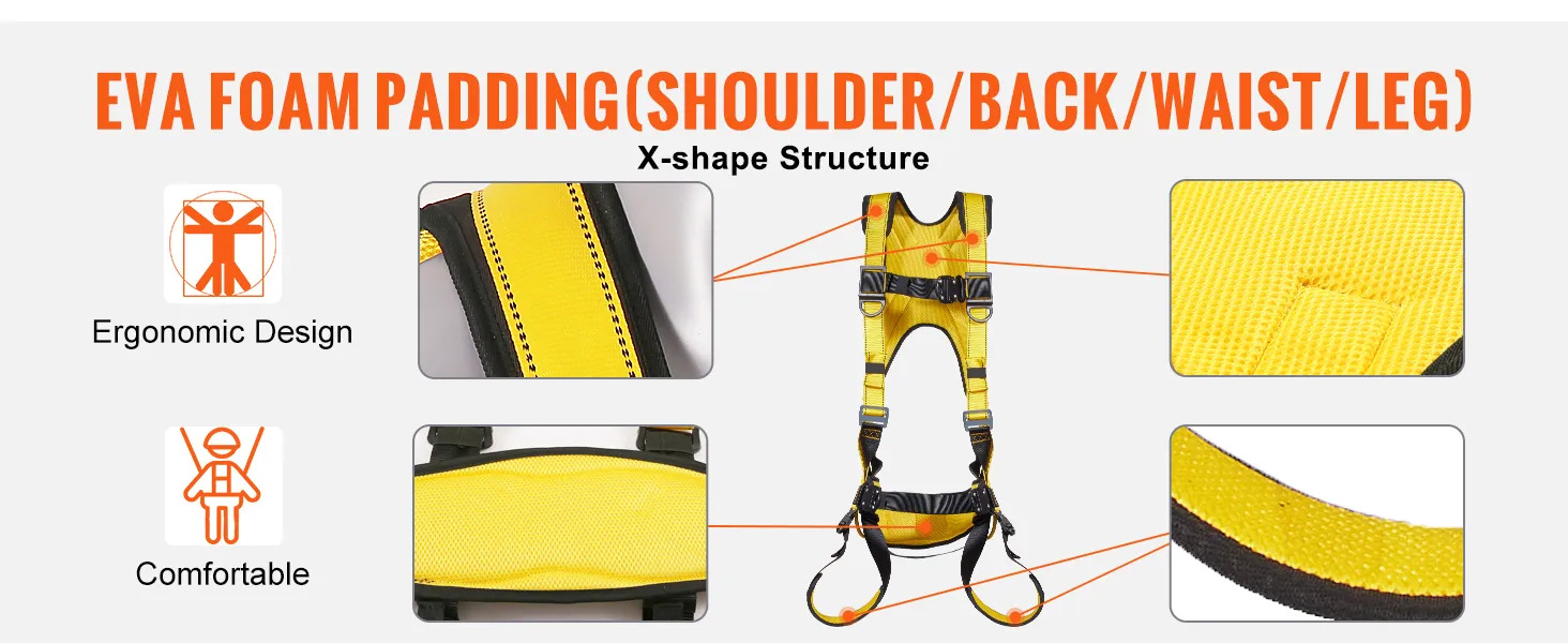 Are you ready for complete fall protection? VEVOR's fall protection harness is made with reinforced polyester webbing and can support up to 240 lbs. Enjoy unparalleled comfort with EVA foam padding on shoulders, back, waist, and legs. Don't compromise your well-being during high-risk activities.