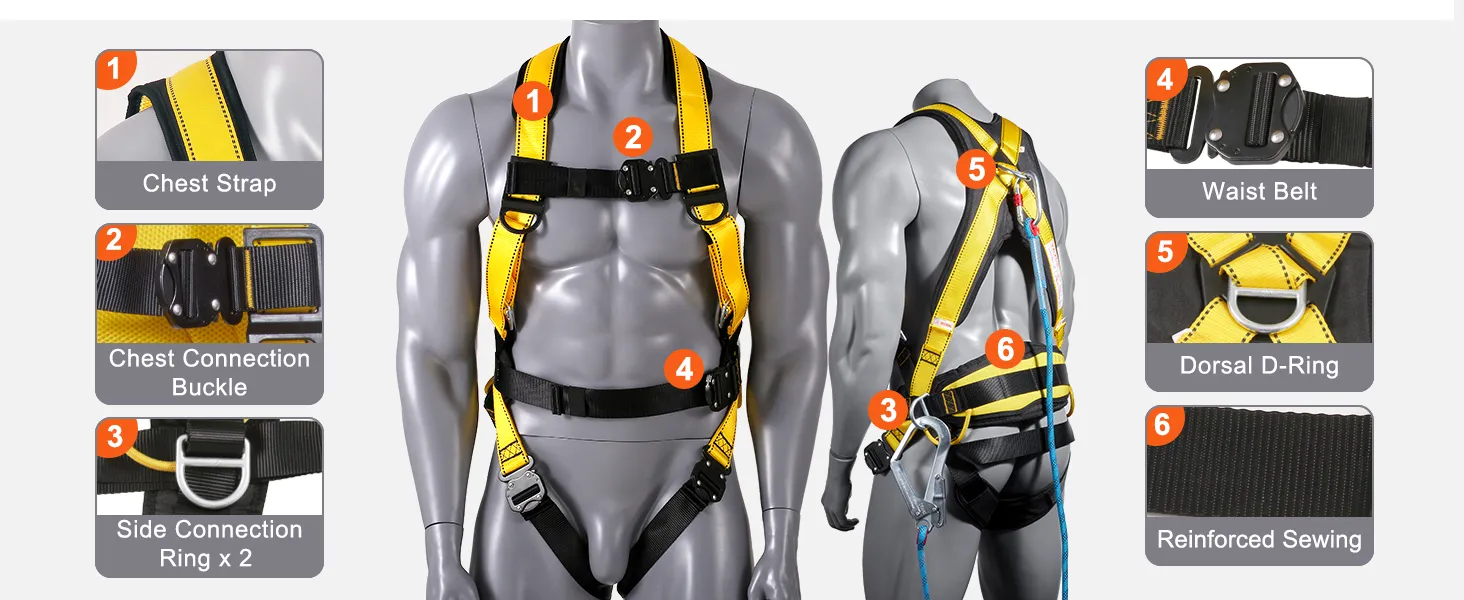 High-strength polyester webbing makes up this harness. It offers a weight range of 140–240 pounds. This feature makes it suitable for various body types. The web tension is 25KN, guaranteeing durability. Our harness meets ANSI/ASSE Z359.11-2014 standards. This guarantees top-notch safety features. You can trust this harness to keep you safe while working at heights.