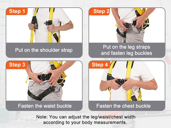 Conveniently designed with chest, waist and legs buckles, the full-body harness is designed for quick and effortless donning and doffing.