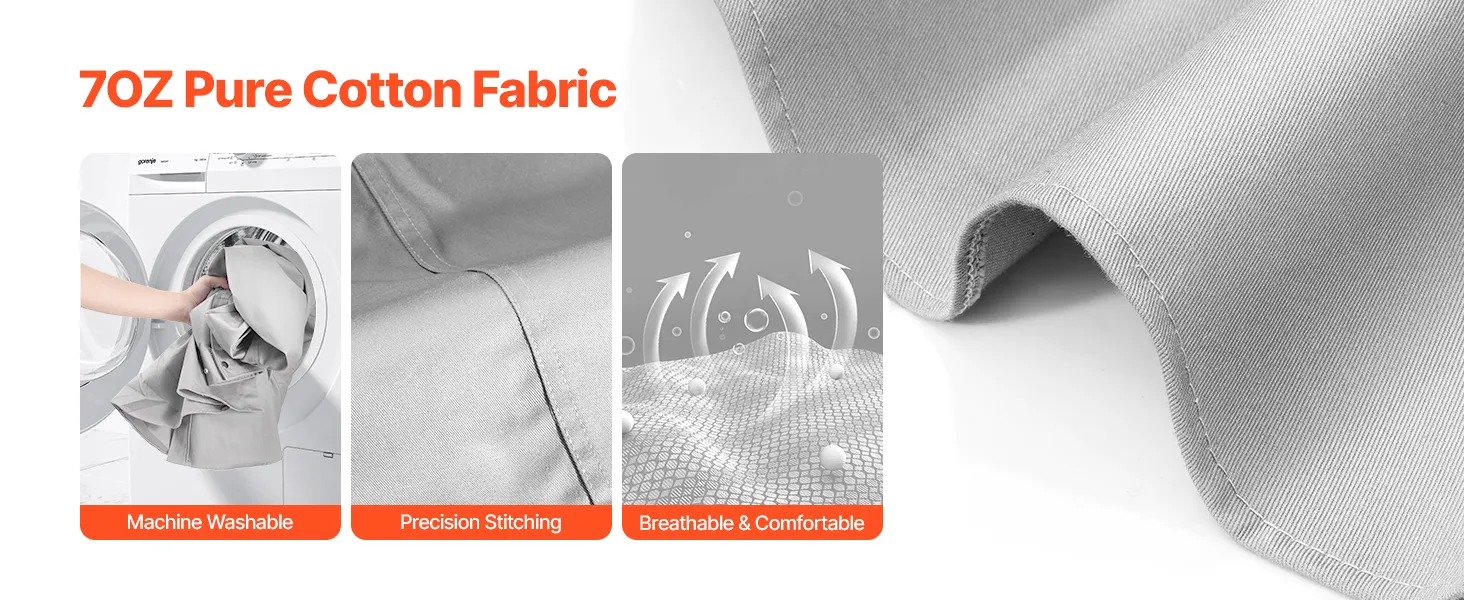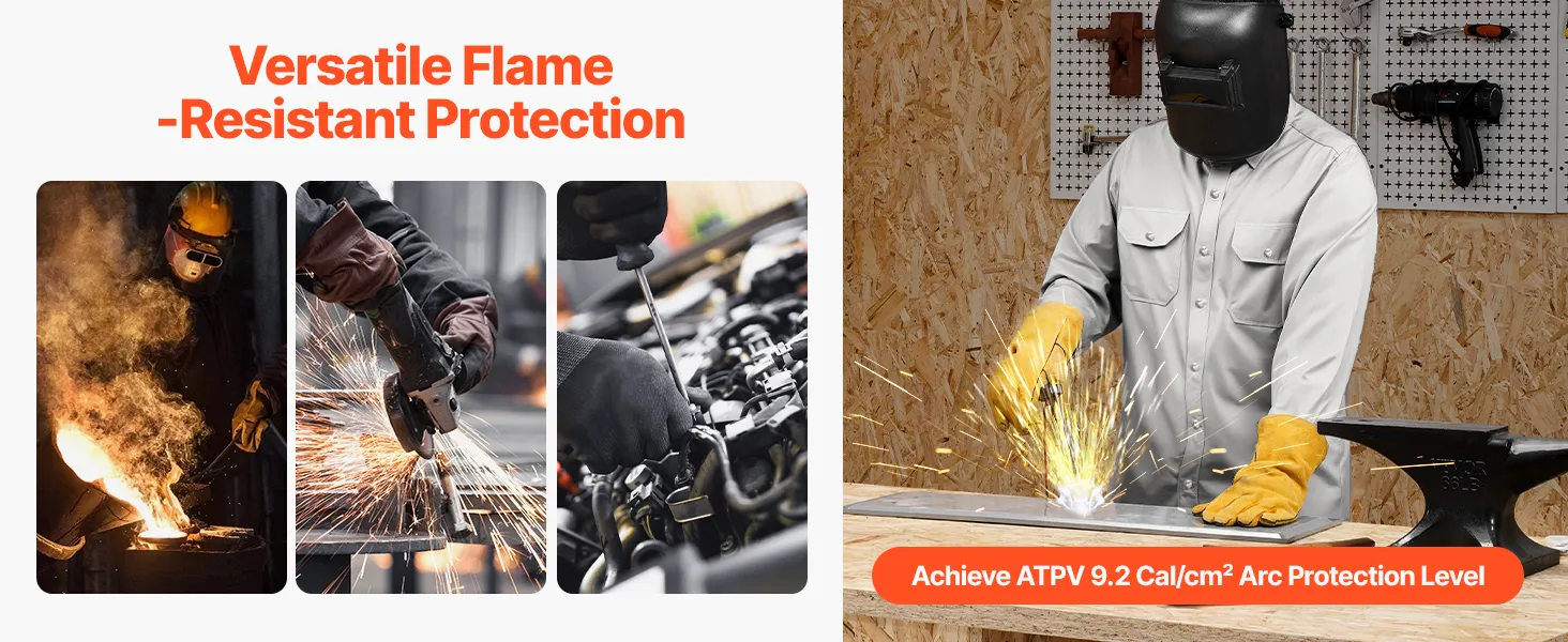 7 oz. FR Pure Cotton: Our welding jacket is crafted from 7 oz. flame-resistant pure cotton, meeting the ATPV 9.2 Cal/cm² arc rating to protect you from sparks, flames, and fire hazards. It provides superior heat insulation, breathability, and comfort, ensuring safe and efficient welding work.