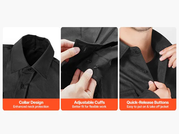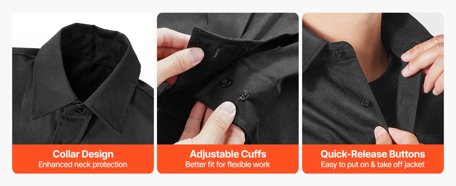 The thoughtfully designed collar provides enhanced neck protection for added safety. Adjustable cuffs offer a better fit, allowing for greater flexibility during work. With quick-release plastic buttons, the welding safety jacket is easy to put on and take off.