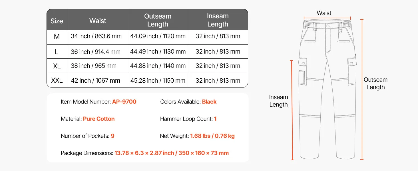 VEVOR FR Pants for Men, 100% Cotton, Flame-Resistant Cargo Pants with Multi-Pockets and Elastic Waist, Reinforced Tear-proof Stitching, Ideal for Welding Work and Casual Wear, L Size, Black