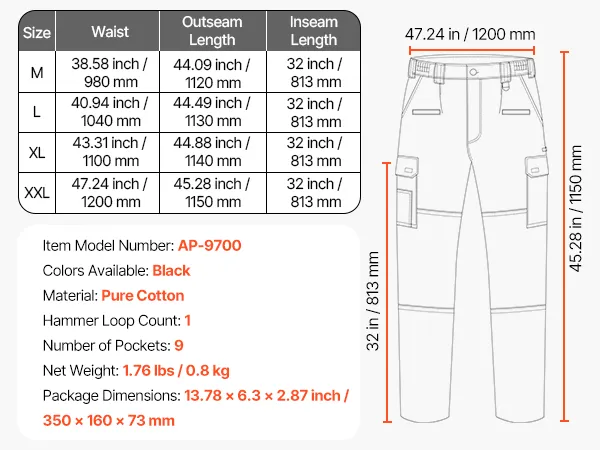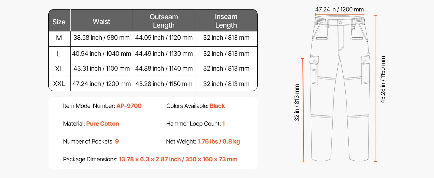 VEVOR FR Pants for Men, 100% Cotton, Flame-Resistant Cargo Pants with Multi-Pockets and Elastic Waist, Reinforced Tear-proof Stitching, Ideal for Welding Work and Casual Wear, XXL Size, Black