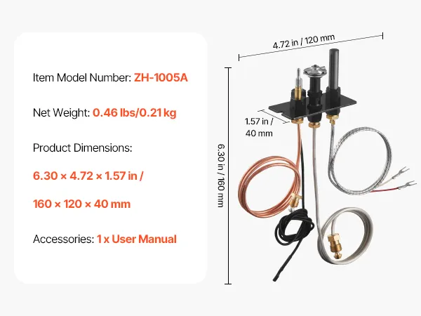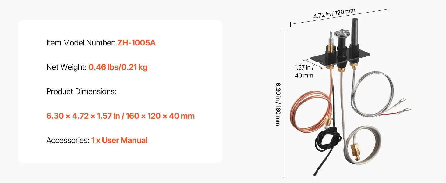 Ignition Assembly: This gas pilot assembly has a 24 in pilot tube, 16 in igniter wire, 22 in thermocouple and 20 thermopile. Equipped with a premium tube, heat-resistant wiring, and a sturdy bracket, it ensures corrosion-resistant, stable heating