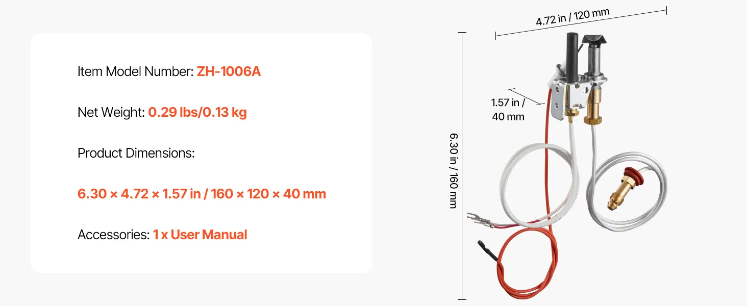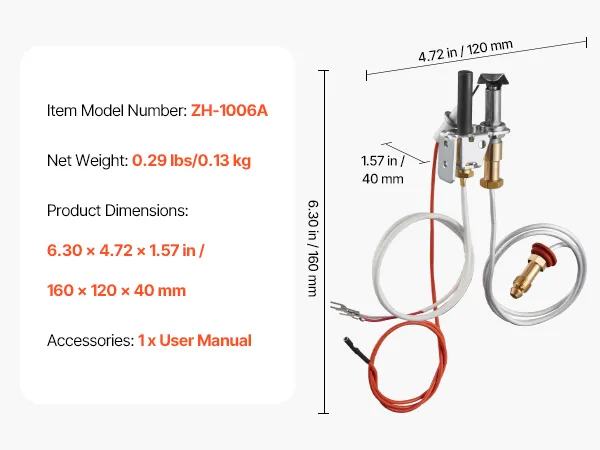 Ignition Assembly: This gas pilot assembly has two 24 in parts (pilot tube, igniter wire) and a 20 in thermopile. Equipped with a premium tube, heat-resistant wiring, and a sturdy bracket, it ensures corrosion-resistant, stable heating