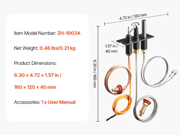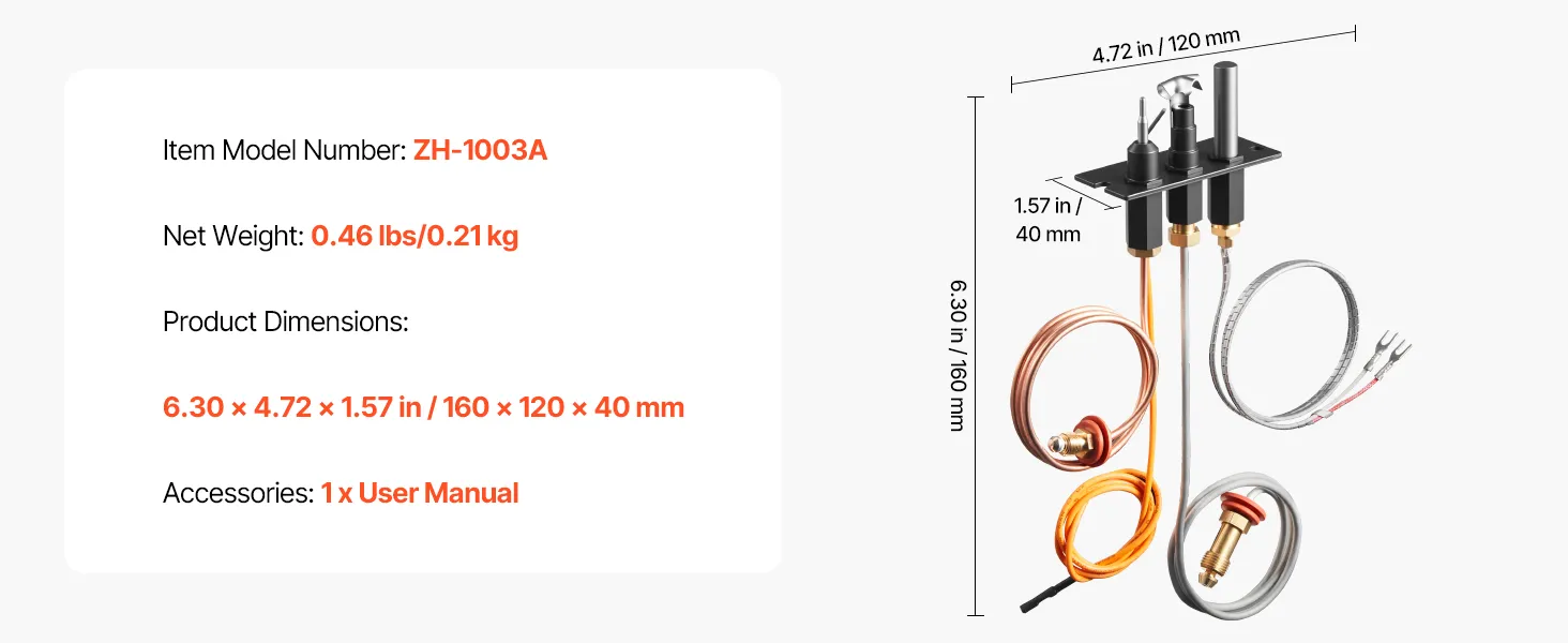 Ignition Assembly: This gas pilot assembly includes four 24 in parts: pilot tube, igniter wire, thermocouple, and thermopile. Equipped with a premium tube, heat-resistant wiring, and a sturdy bracket, it ensures corrosion-resistant, stable heating