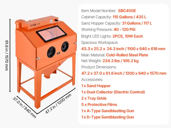 Efficiently tackle paint and rust removal on oversized parts for superior surface finishing with our 435L sandblasting cabinet. Its spacious 1100 x 640 x 618 mm interior, 117L media hopper, and powerful 1200W dust collector provide ample space and high efficiency for large projects.