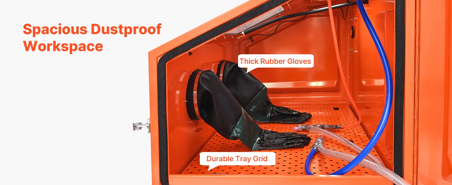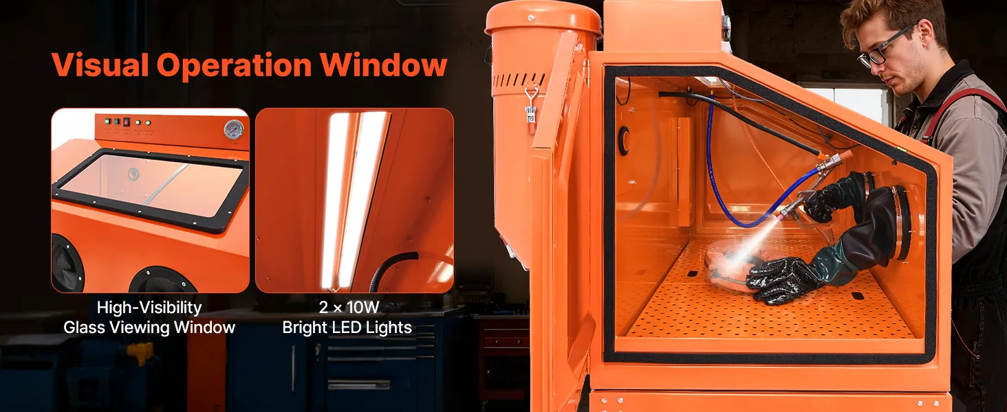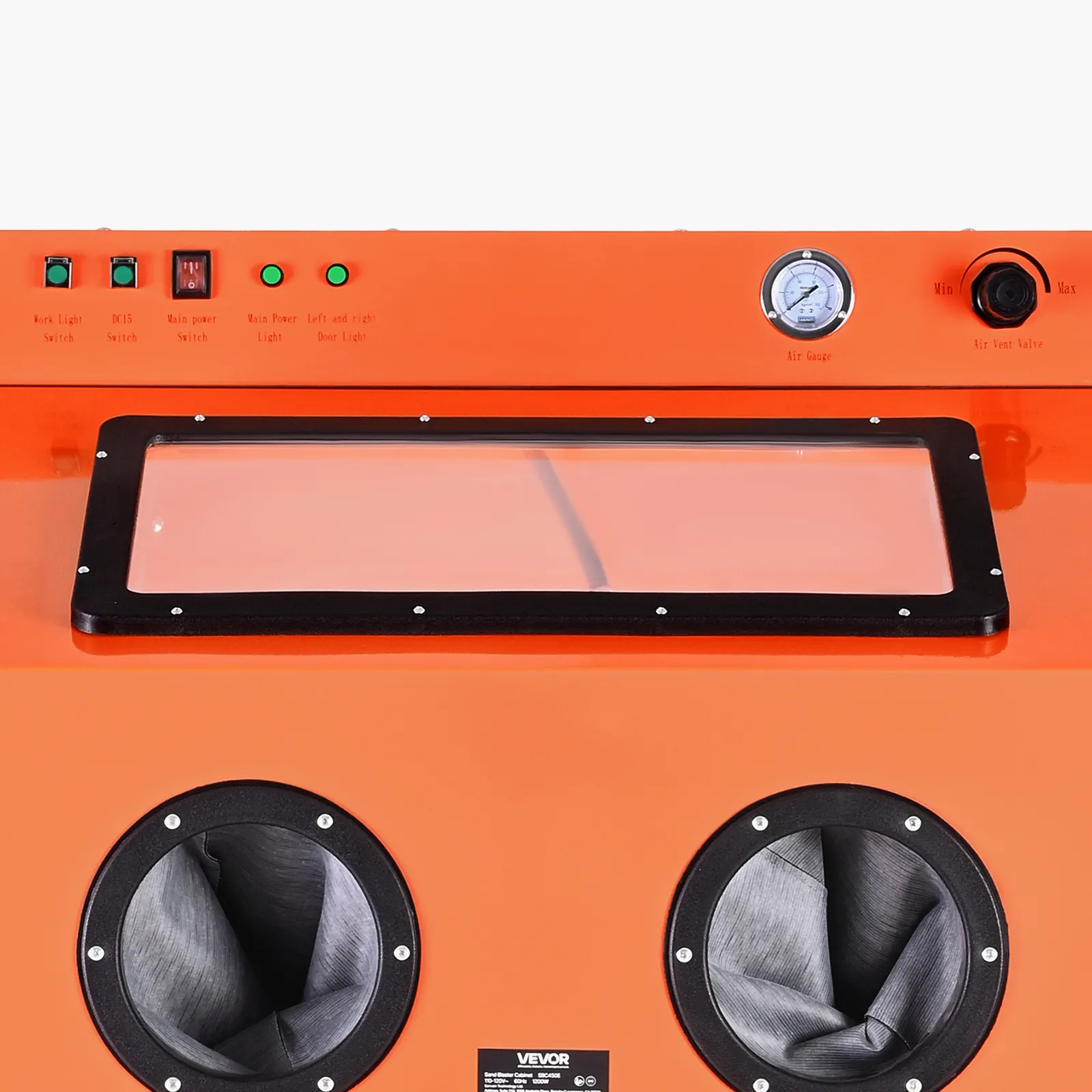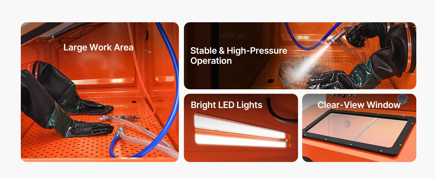 Spacious for Oversized Parts: Tackle large projects with ease inside our massive 1100 x 640 x 618mm interior, the cabinet offers a generous 435L capacity work area and 117L media hopper. Built with heavy-duty cold-rolled steel, this sandblasting cabinet is made to withstand the demands of daily shop use