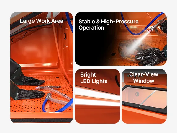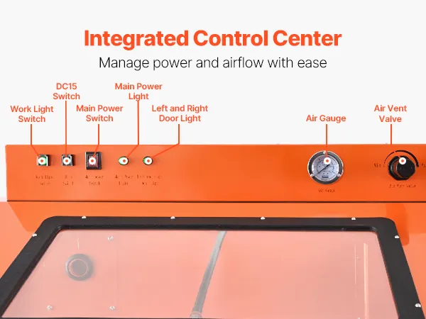 Operate your sandblasting system effortlessly with the integrated control center. All functions—lighting, airflow, and power—are centrally managed for quick, intuitive operation, ensuring a smoother workflow and safer blasting experience.