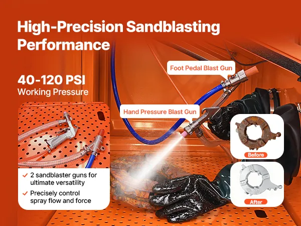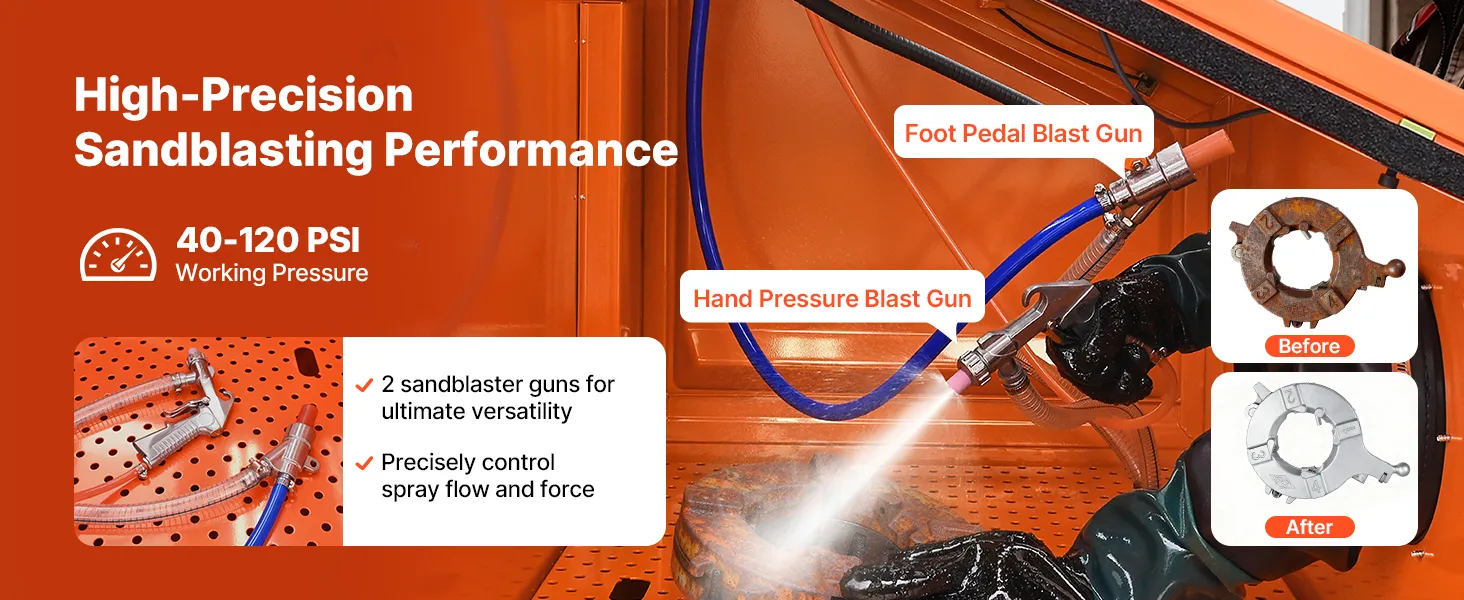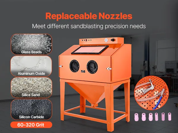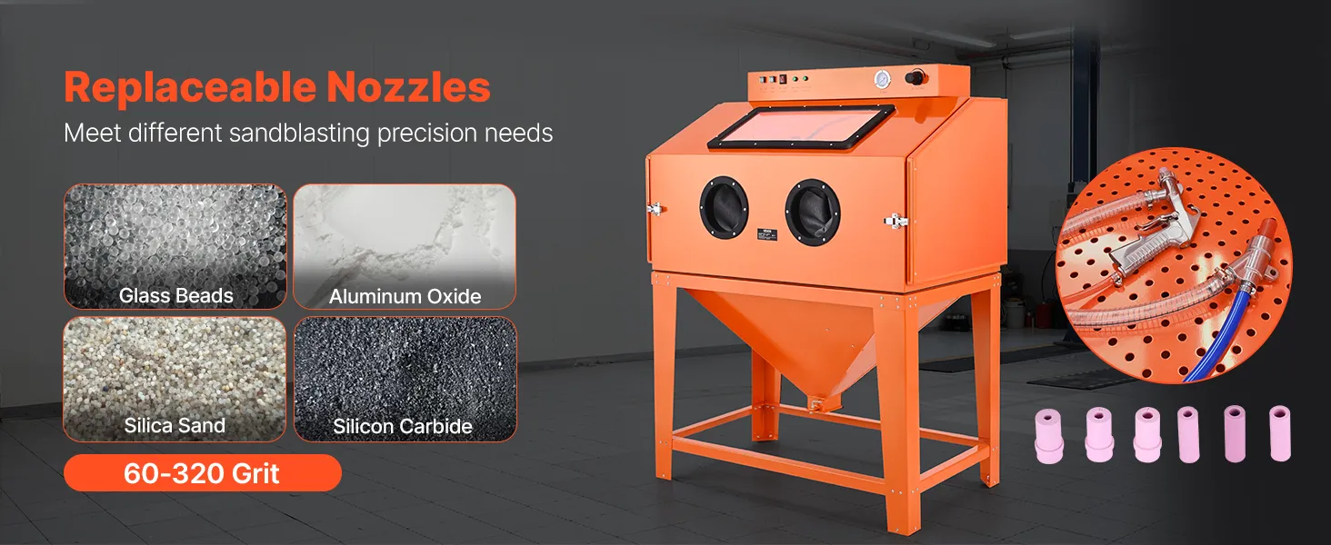 Dual-Control Blast Guns Kit: Switch between the hand-pressure gun for detailed work and the foot-pedal gun for fatigue-free, prolonged blasting. This unmatched flexibility, combined with a full set of 8 ceramic nozzles (sizes from Ø4.5 to Ø10, two are pre-installed), allows you to adapt to any project—from aggressive stripping with a large nozzle to delicate etching with a fine one