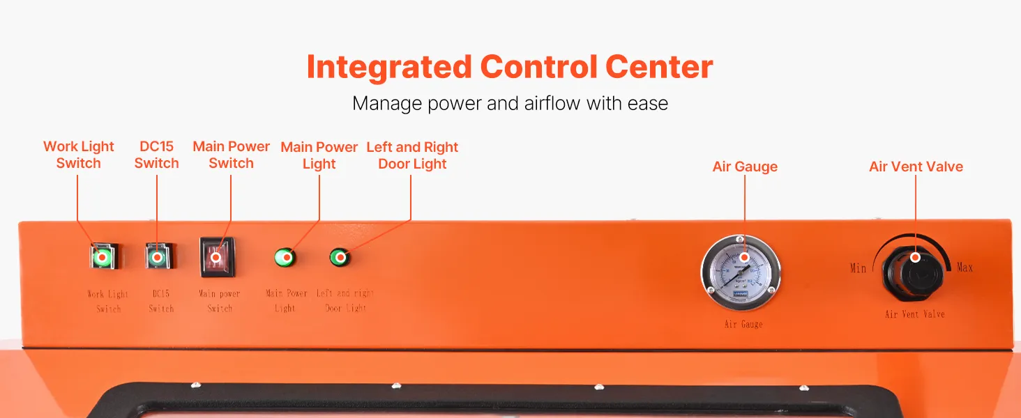 Integrated Control for Safety & Convenience: Keep all commands at your fingertips with the centralized electrical and air control box. It features a power switch, light switch, dust vacuum switch, precise pressure regulator and air gauge for streamlined, safe, and intuitive operation