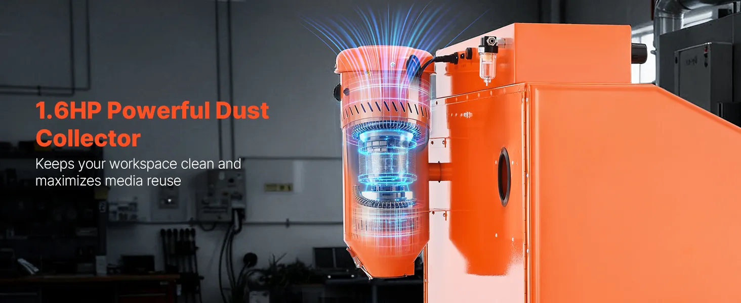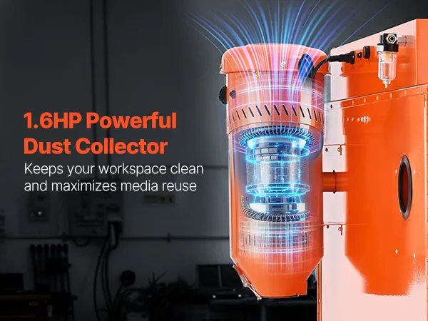 Effective Dust Control for Clean Operation: Equipped with a 1200W powerful dust collector, it provides strong suction to efficiently capture dust and debris, maximizing media reuse while maintaining a cleaner and healthier workspace