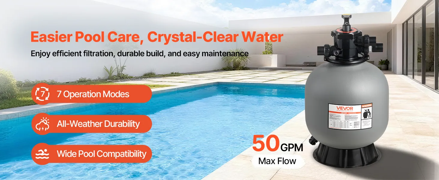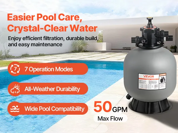 Swim in Clear Water Anytime: This high-performance sand filter circulates up to 50 GPM for smooth water flow and fast cleaning. Enjoy fresh, clear pool water whenever you’re ready to dive in—no long waiting for filtration