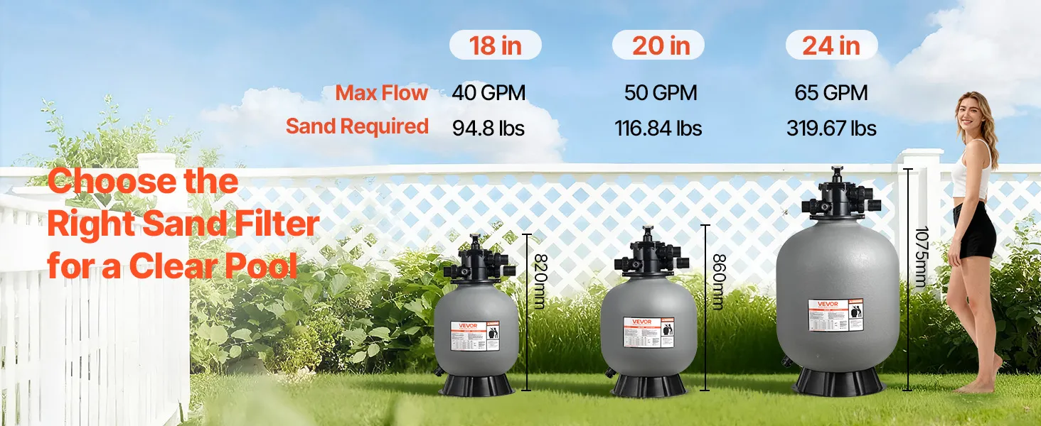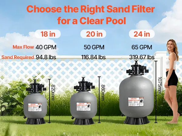 Available in 18-inch, 20-inch, and 24-inch models, this swimming pool sand filter lets you choose the right size for your pool setup. Get a filtration system that fits your space and matches your swimming needs.