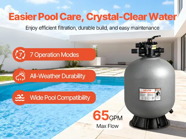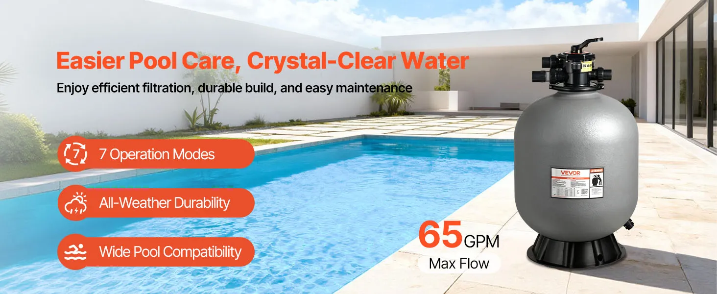 Swim in Clear Water Anytime: This high-performance sand filter circulates up to 65 GPM for smooth water flow and fast cleaning. Enjoy fresh, clear pool water whenever you’re ready to dive in—no long waiting for filtration