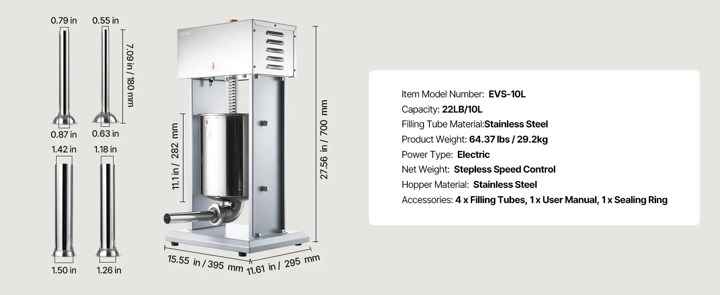 VEVOR Electric Sausage Stuffer, 22 LBS / 10 L Vertical Meat Filler with Stepless Speed Adjustment, Stainless Steel Sausage Stuffing Machine, Foot Pedal & 4 Filling Tubes, for Commercial and Home Use