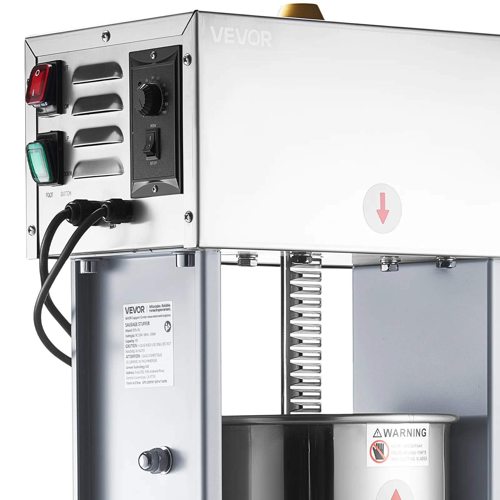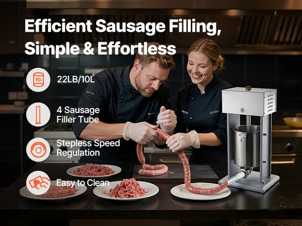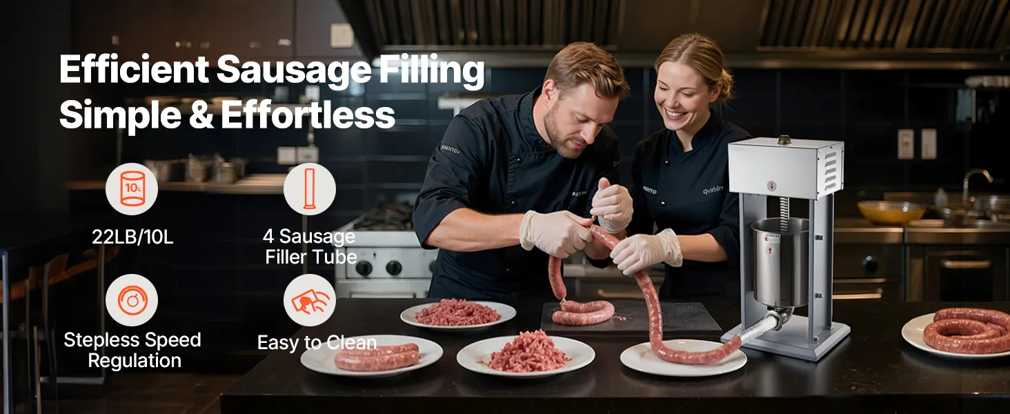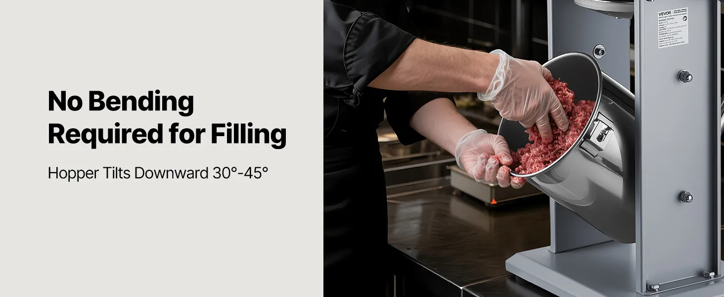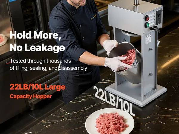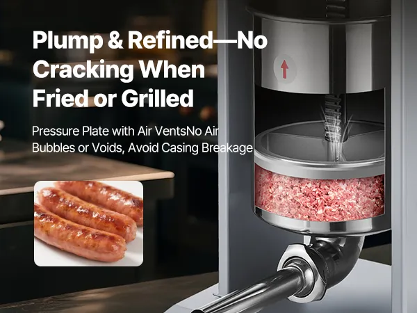 Powerful & Dense Filling: Equipped with a 200W motor, this sausage maker delivers strong and stable performance, suitable for commercial applications. The vented pressure plate improves output efficiency and produces firm sausages without trapped air
