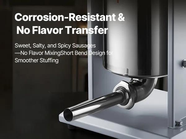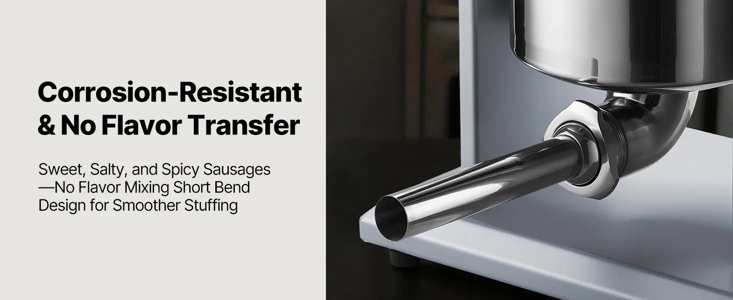 Large Volume Capacity: The meat stuffer features a tilting barrel with a capacity of up to 22 lbs / 10 L of meat. Designed for large-batch processing in professional kitchens, it minimizes the need for frequent refilling. Stainless steel construction ensures durability and is rust-resistant