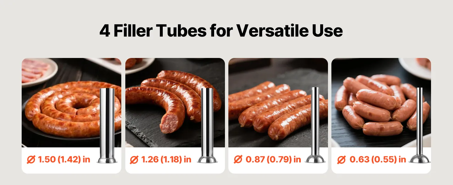Full Set of Accessories: This vertical sausage stuffer includes four high-quality stuffing tubes: ⌀0.63(0.55) in, ⌀0.87(0.79) in, ⌀1.26(1.18) in, and ⌀1.50(1.42) in. All food-contact components are made of food-grade materials with smooth, burr-free interiors