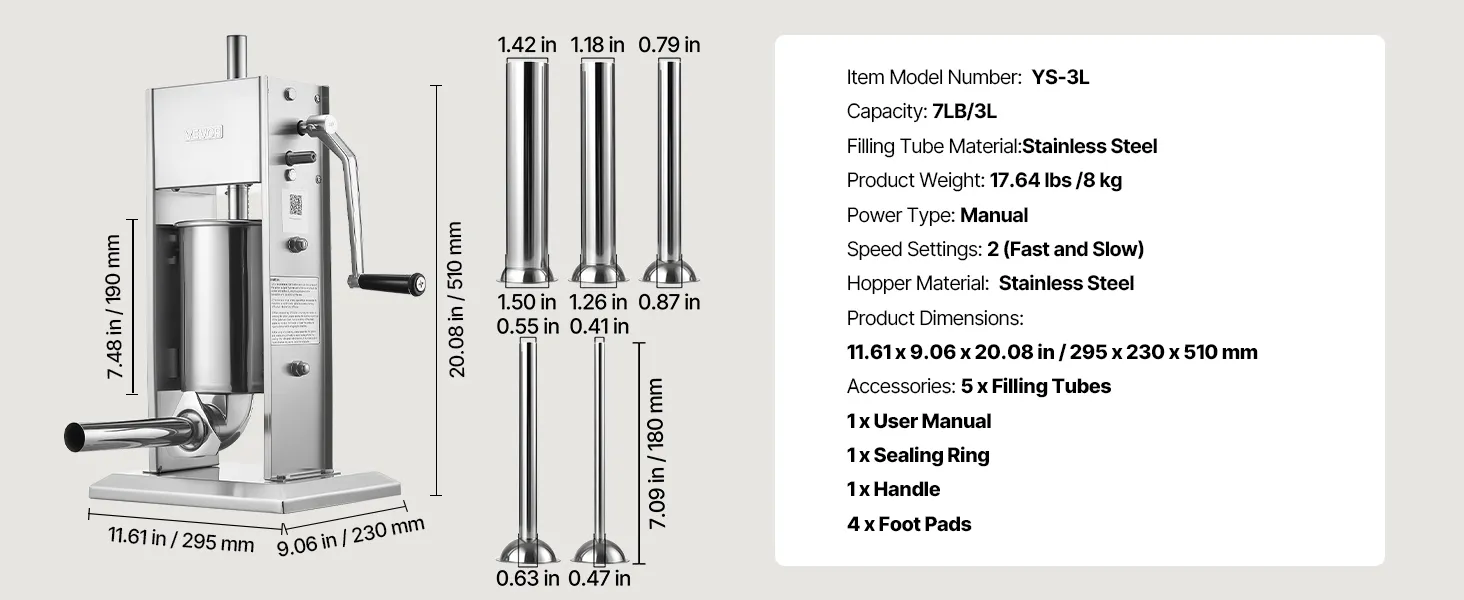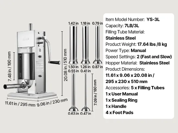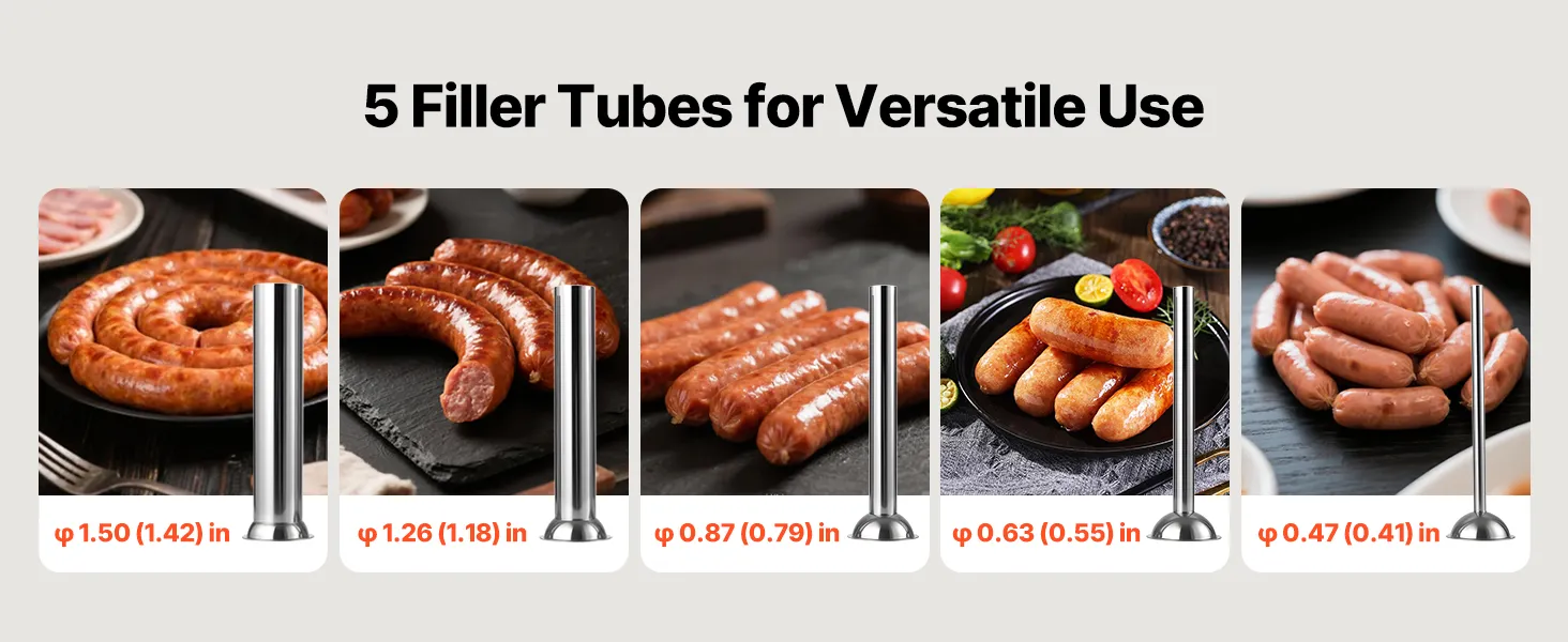 Multiple Tube Sizes: This vertical sausage stuffer comes with five premium stuffing tubes: ⌀0.47(0.41) in, ⌀0.63(0.55) in, ⌀0.87(0.79) in, ⌀1.26(1.18) in, and ⌀1.50(1.42) in. All components that contact food are smooth, burr-free, and comply with food-grade standards
