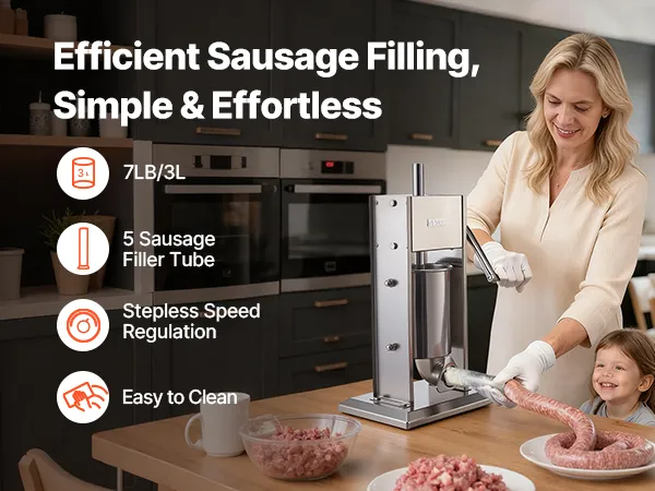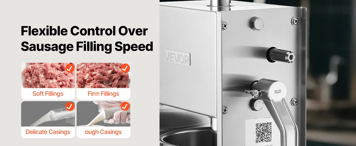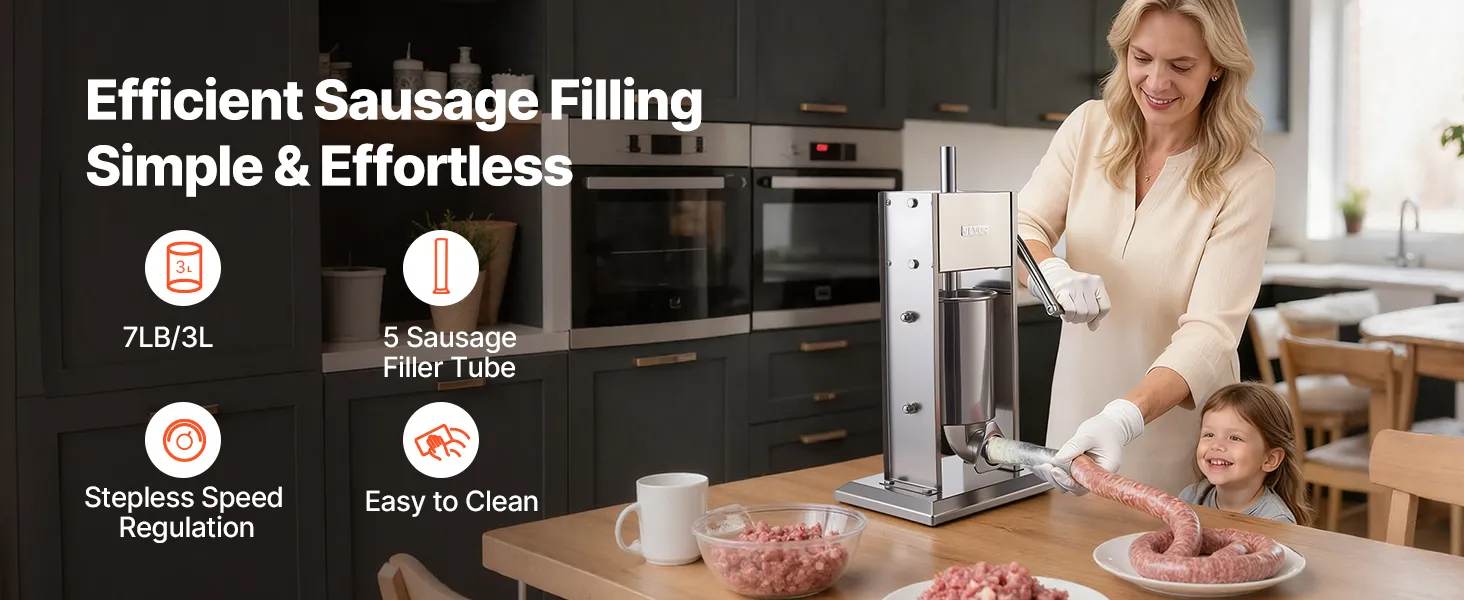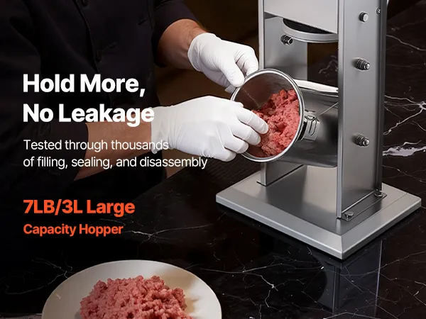 This manual sausage stuffer features an upgraded pressure plate with vent holes, producing firmer sausages with fewer air bubbles. With 2-speed control and an 7 lbs / 3 L large capacity, it's ideal for efficient home sausage making.