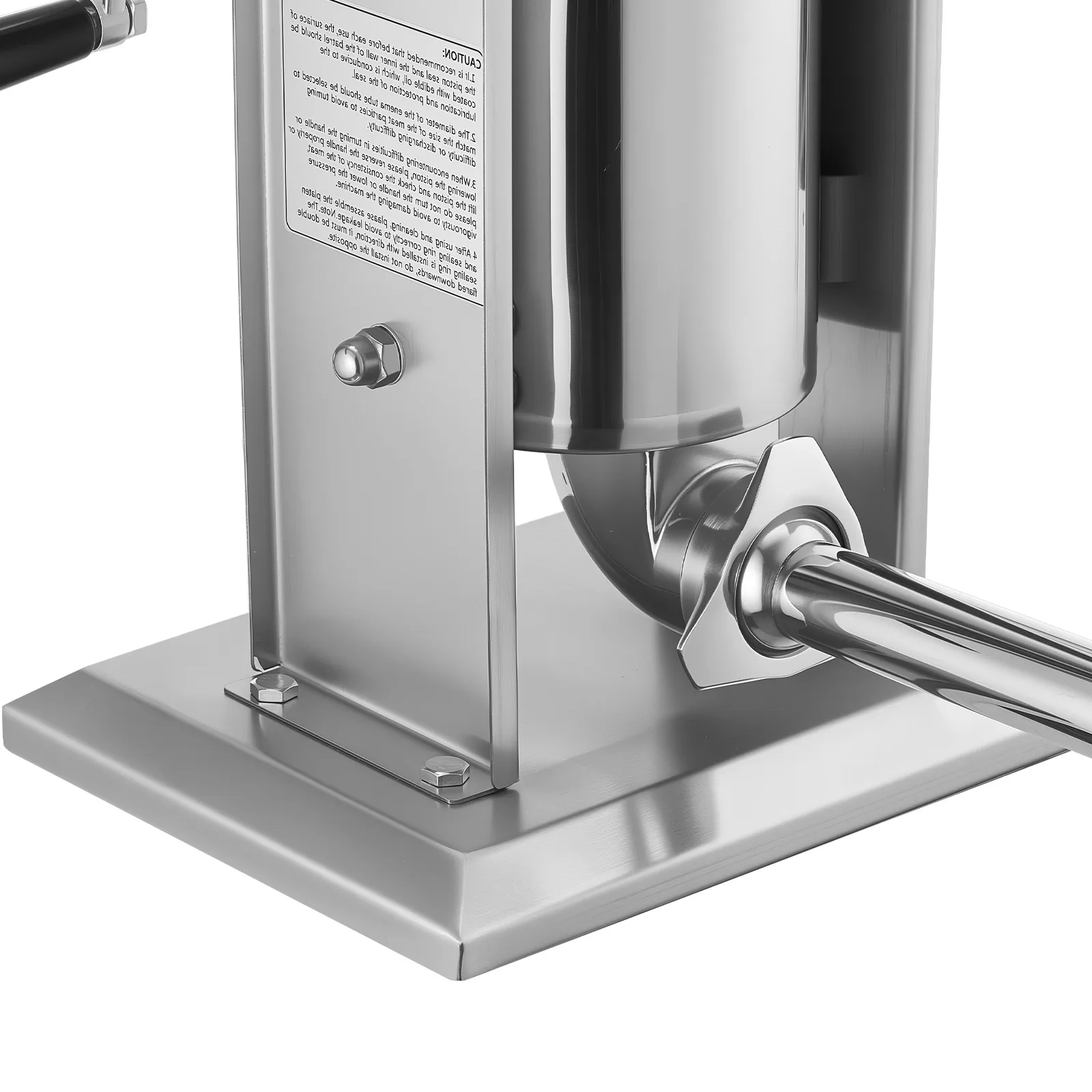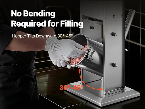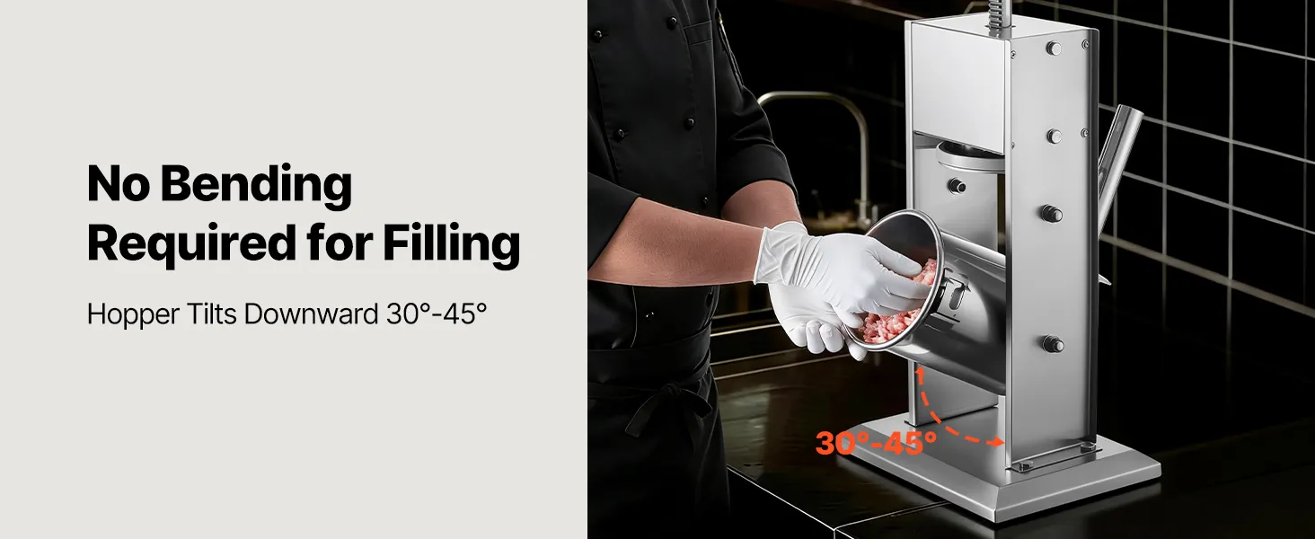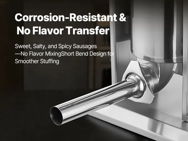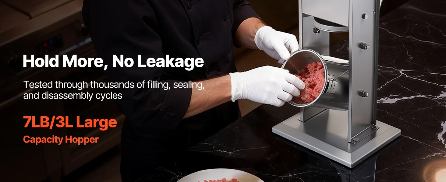 Generous Capacity: The tilting barrel of this meat stuffer can hold up to 7 lbs / 3 L of meat. Ideal for producing larger batches at once, it reduces the need for constant refilling. The barrel, tubes, frame, and base are all crafted from stainless steel for long-lasting, rust-resistant use