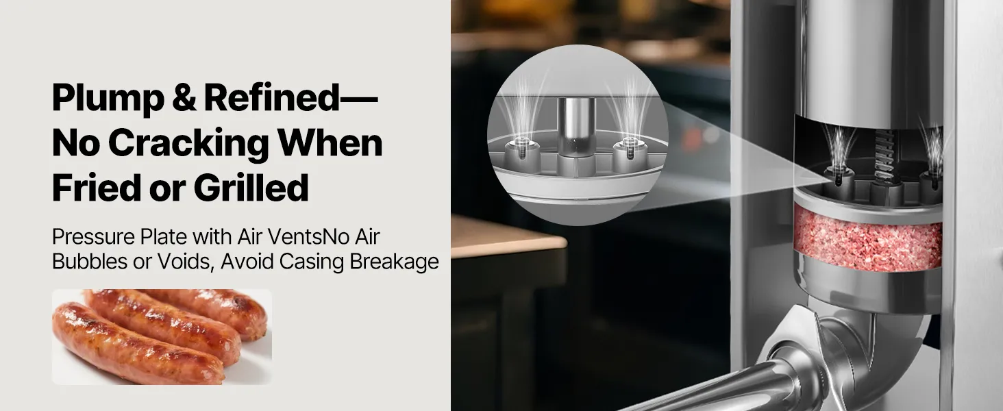 Tight & Even Filling: The pressure plate of this sausage machine is designed with air-release holes to expel excess air during pressing. There’s no need to puncture casings repeatedly or worry about tearing. You’ll get firm, evenly shaped sausages with excellent bite and texture