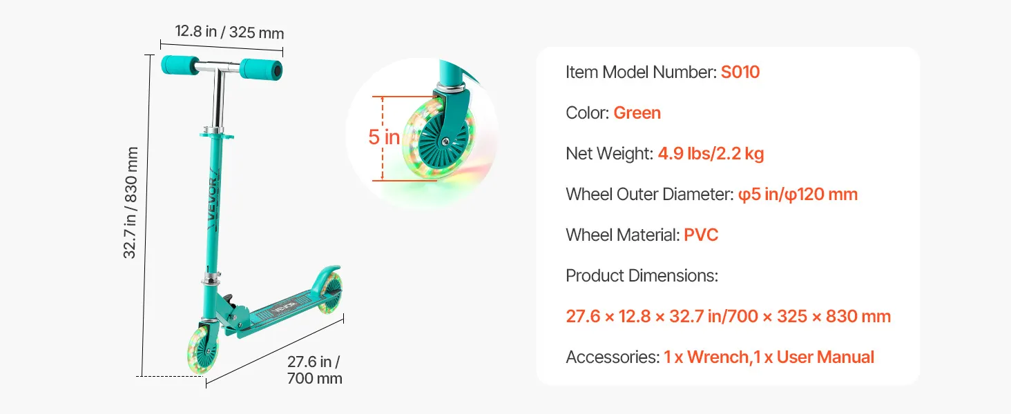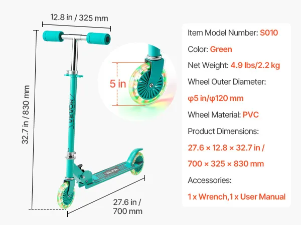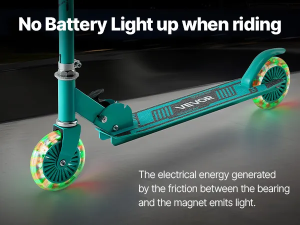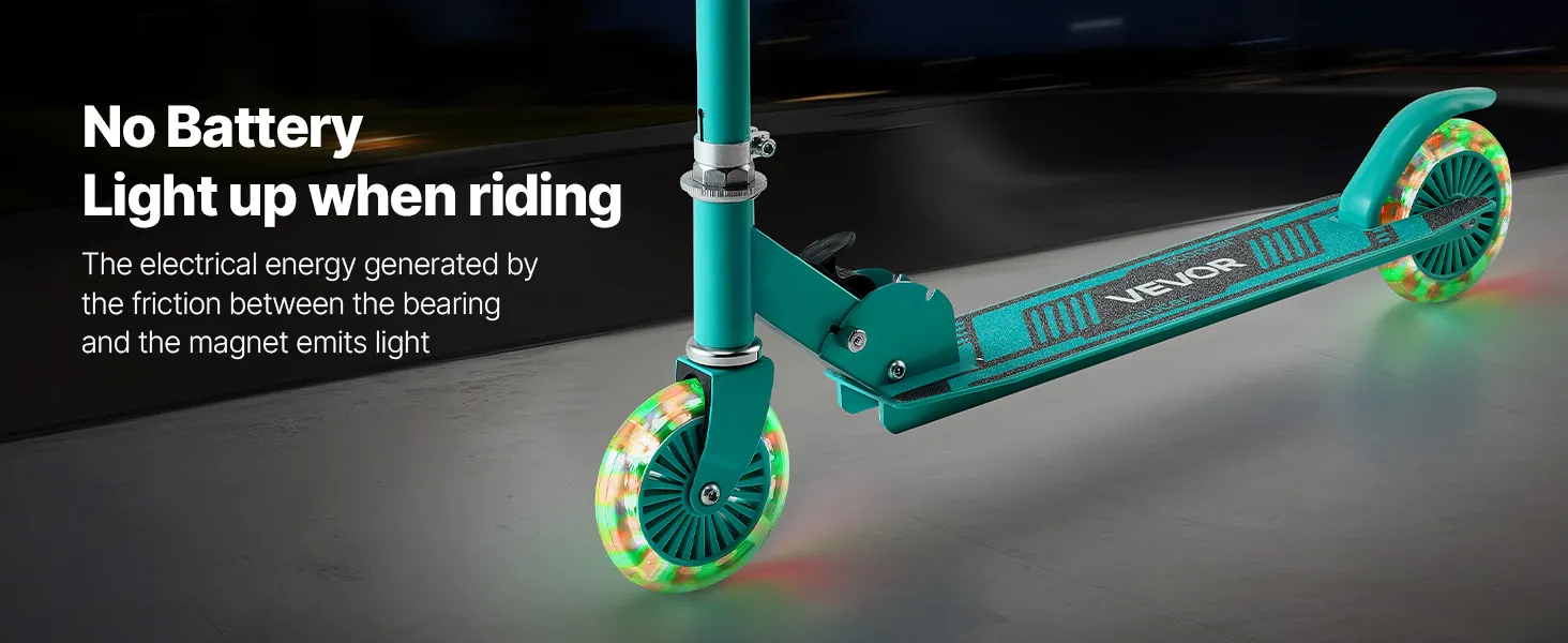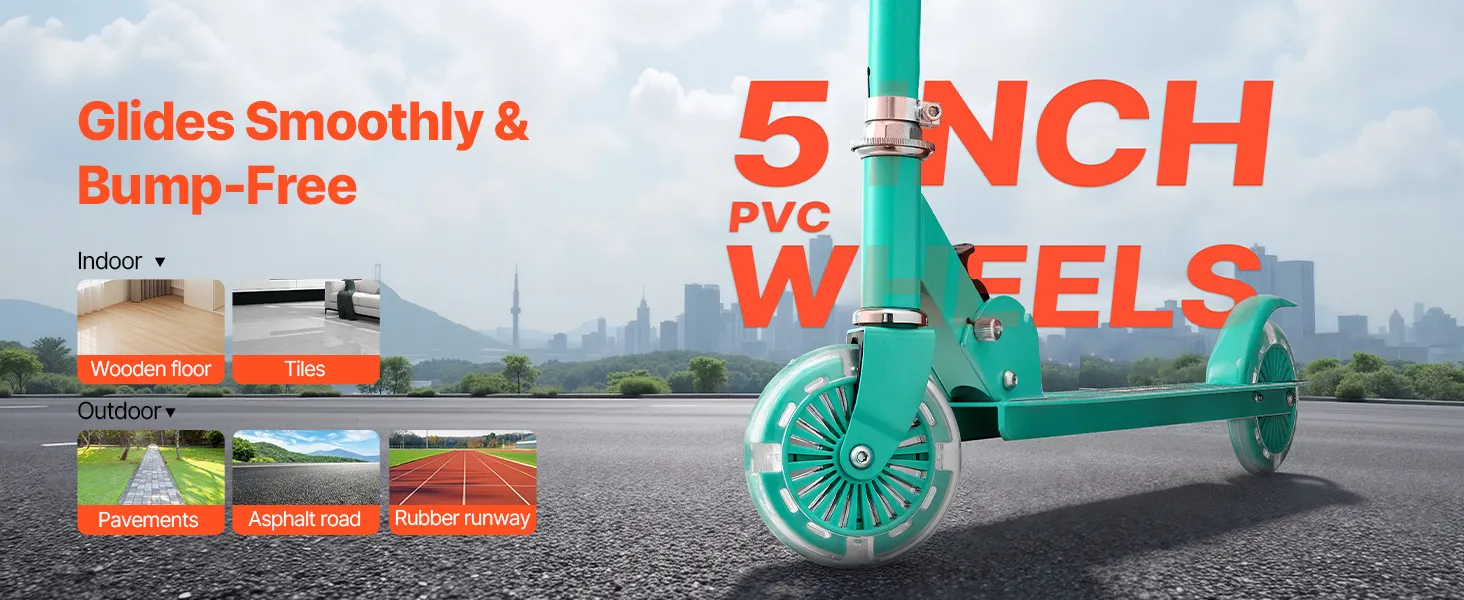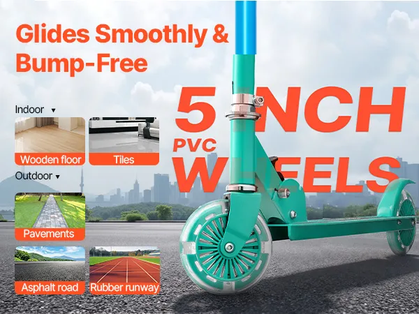 5-Inch Light-Up Wheels: Kick scooter wheels light up automatically when rolling—no batteries needed! Add fun and visibility for night rides. Large 5-inch wheels glide smoothly on sidewalks, asphalt, wood floors, and tiles with fewer bumps and less noise