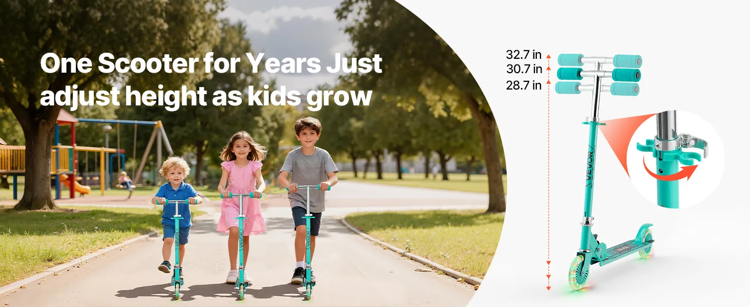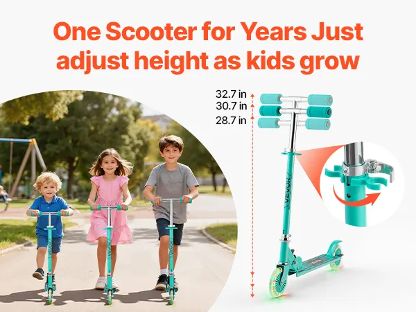 Adjustable Height: Adjustable handlebar with three height settings: 28.7/30.7/32.7 in (730/780/830 mm). This kids kick scooter grows with your child, so you won't need to replace it as they grow taller
