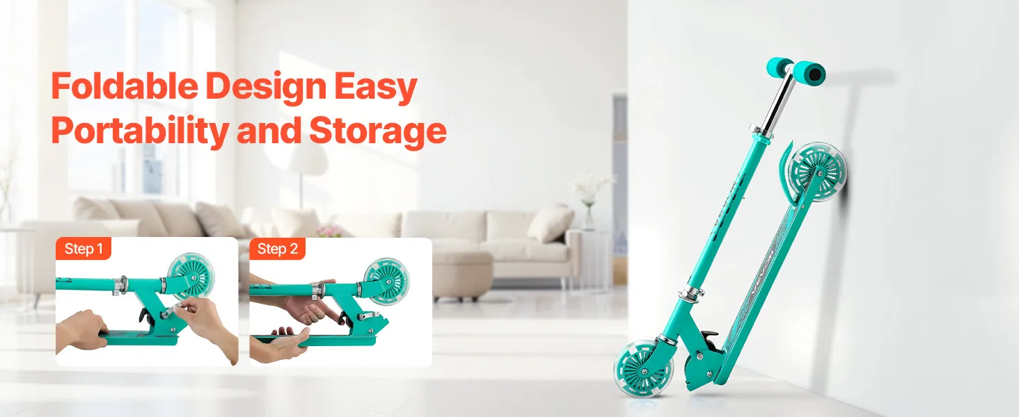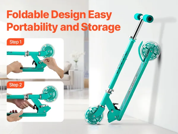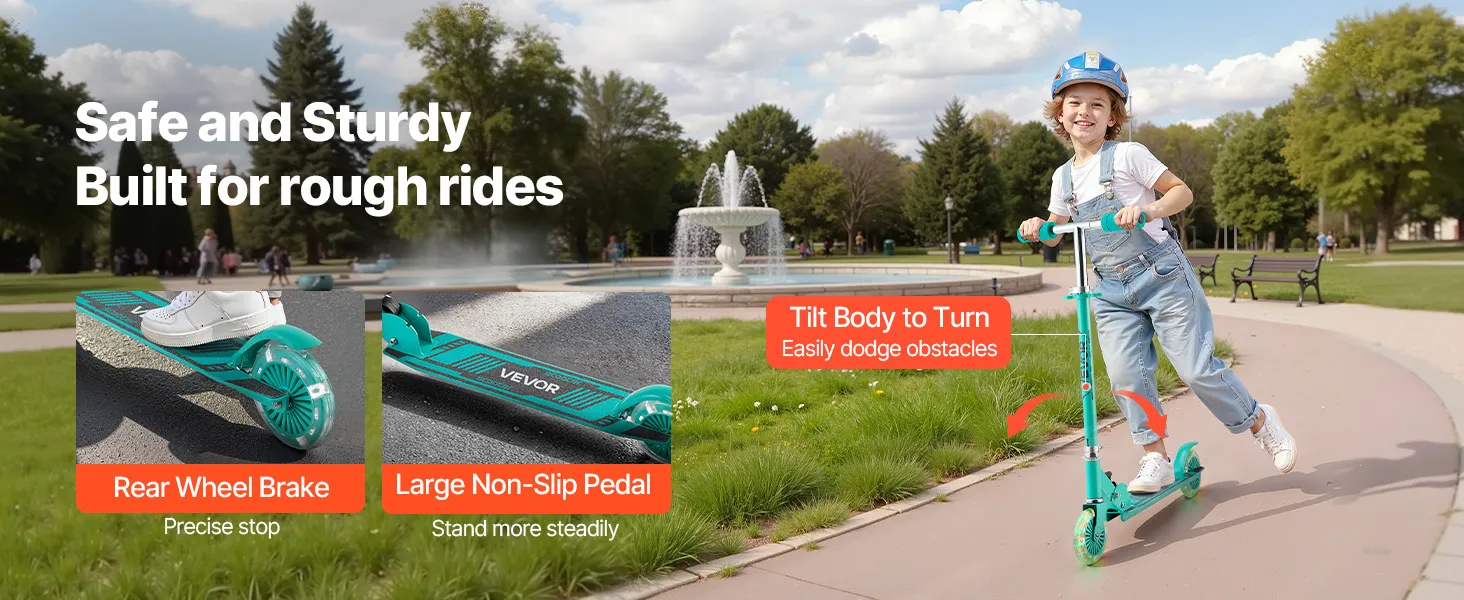 Safe Ride & Foldable: The kids scooter's wide non-slip foot deck provides better stability. Rear-wheel foot brake allows easy, controlled stops. It folds quickly and features a lightweight build—easy for kids to carry or store in the car trunk